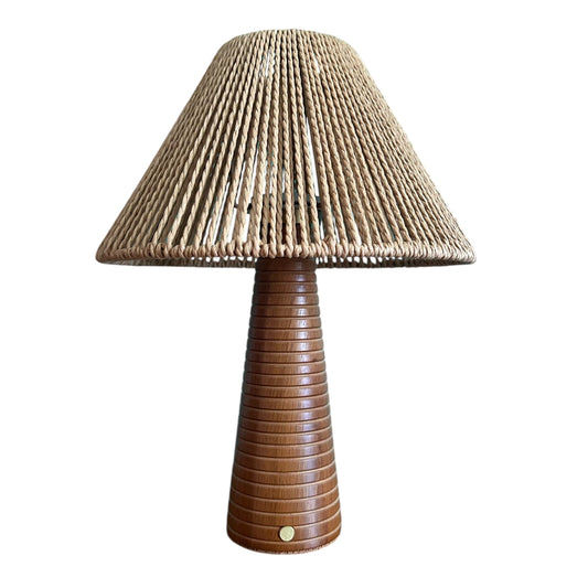 Ribbed Teak style rechargeable touch lamp with rope shade
