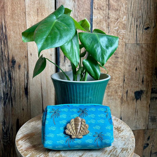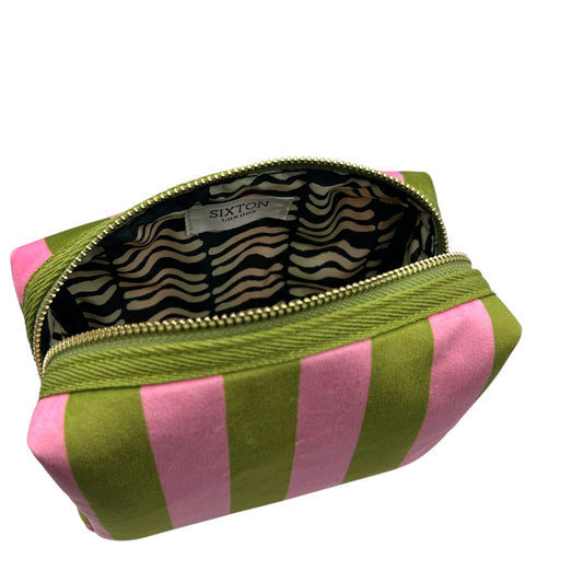 Chartreuse stripe makeup bag with Sunray Eye pin