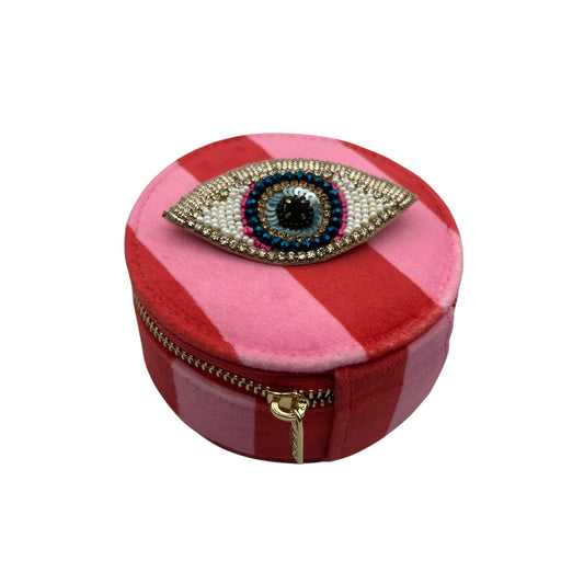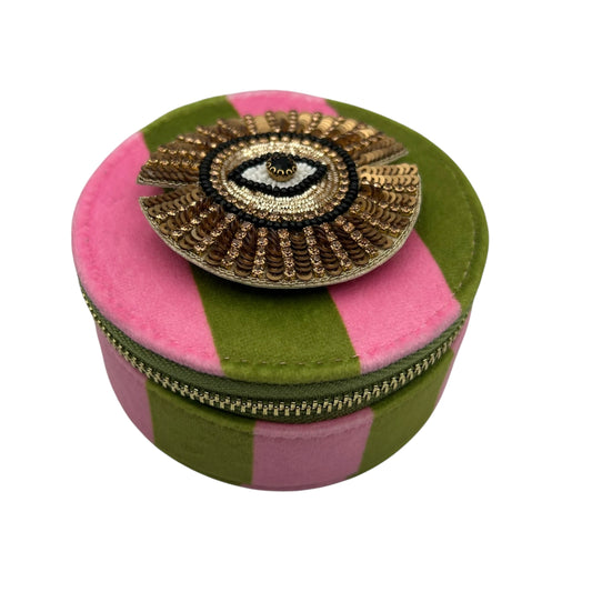 Jewellery Travel Pot in pink stripe - Sunray Eye brooch