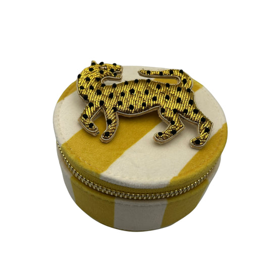 Jewellery Travel Pot in yellow stripe - Leopard brooch