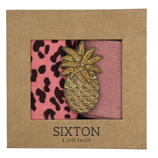 Pink Leopard & Pale Pink Vegas sock box duo with embroidered brooch