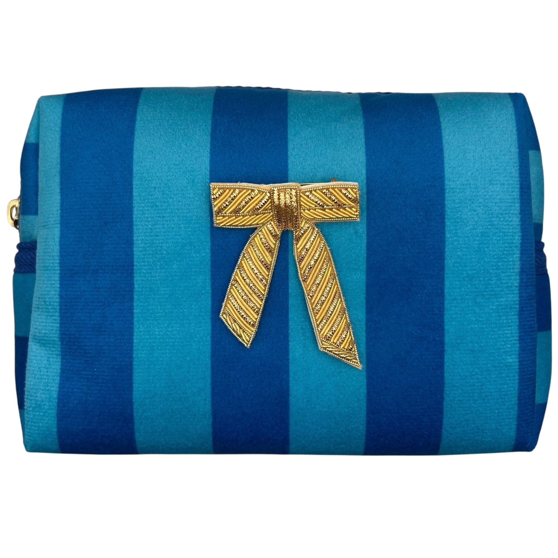 A gorgeous blue striped velvet makeup bag, with a detachable bow brooch.