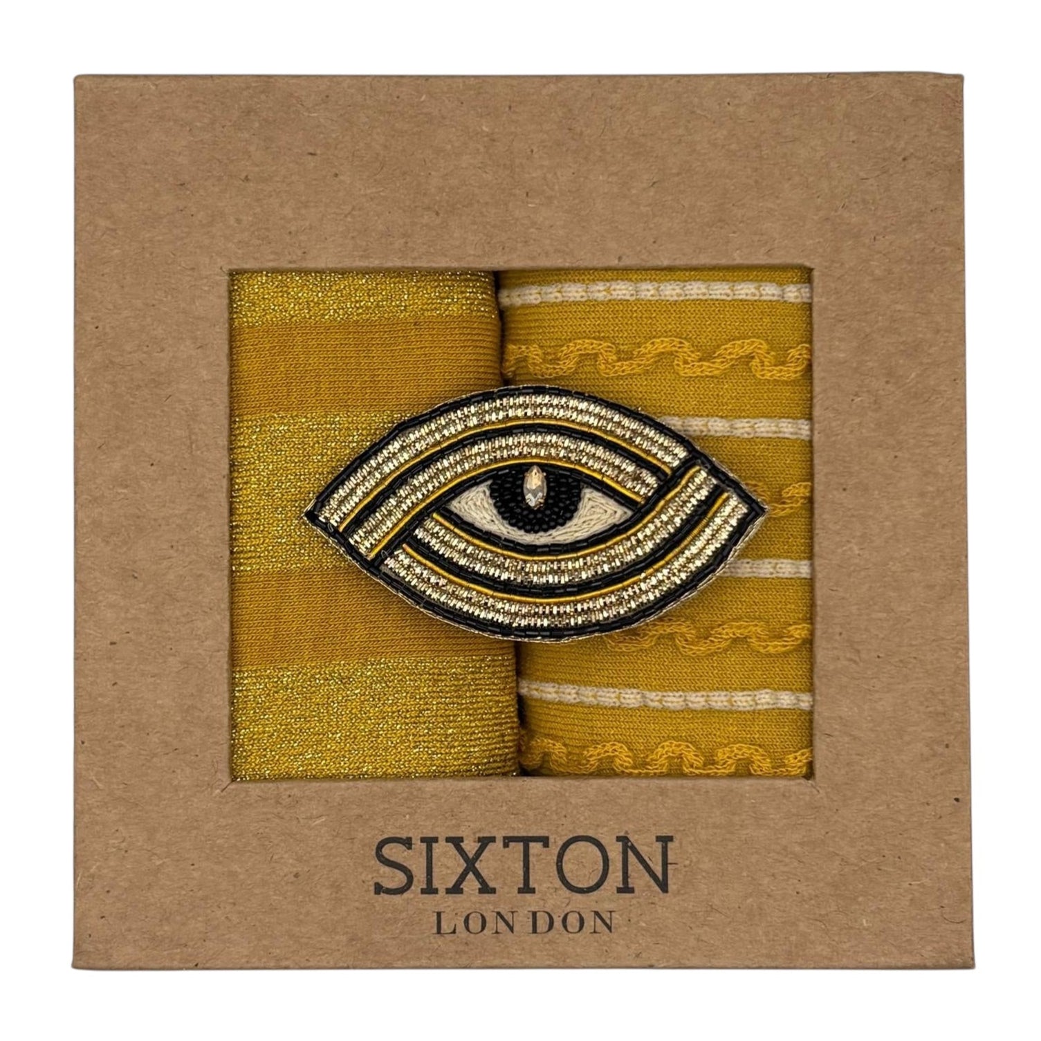 Mustard Berlin & Sunshine Lyon sock box duo with embroidered brooch
