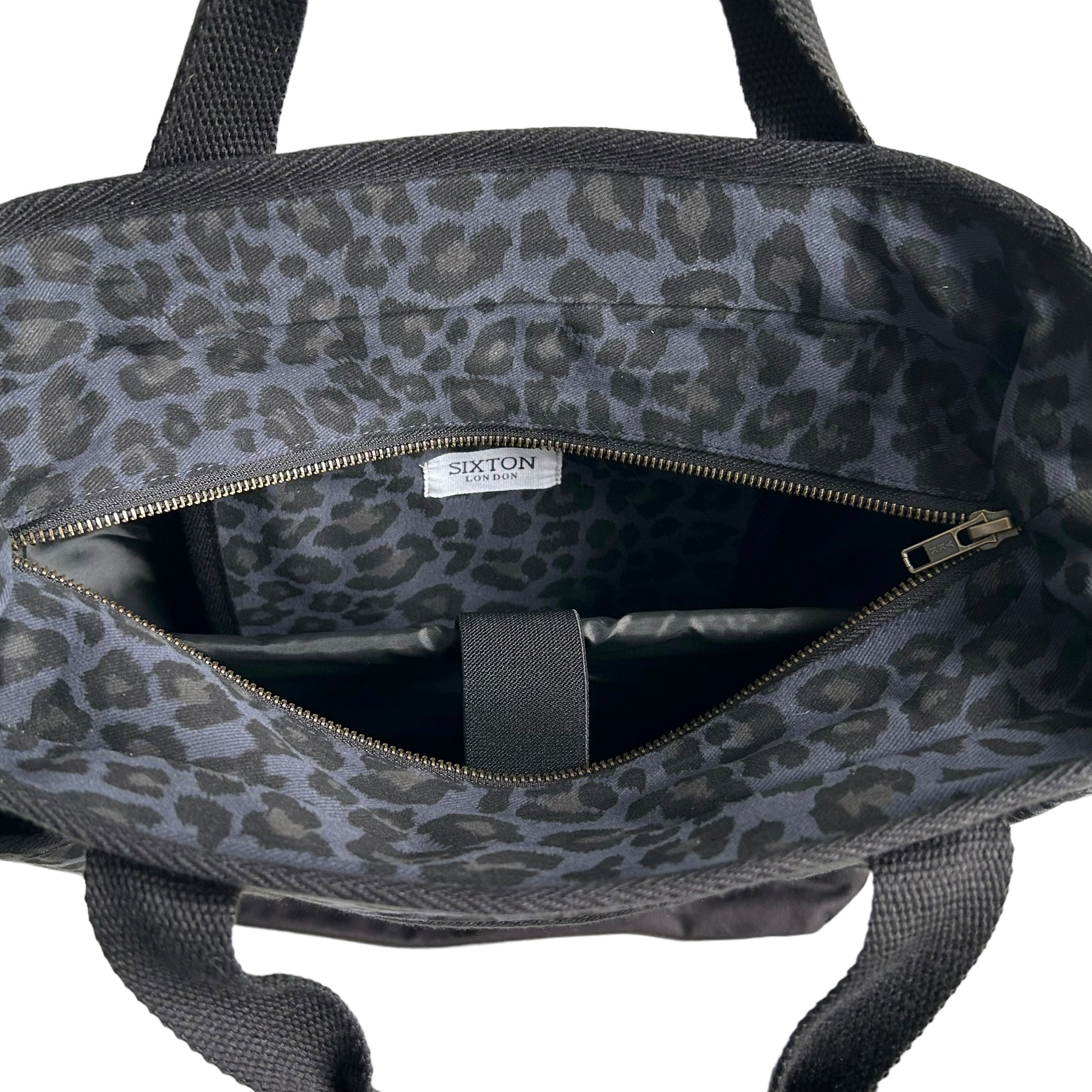 A statement backpack in a striking, dark blue leopard print, made from recycled cotton.