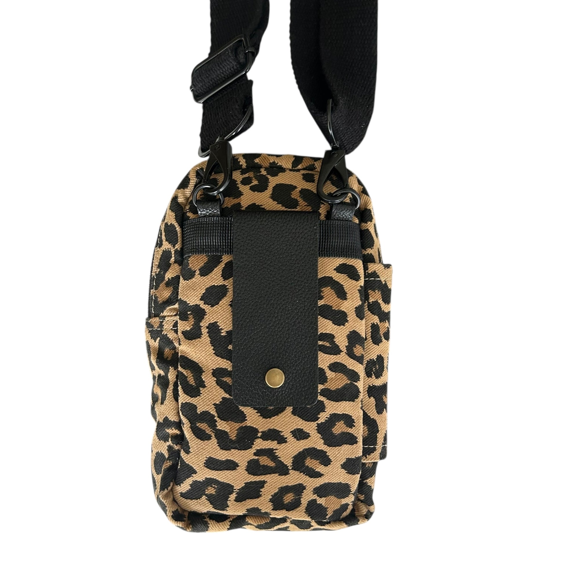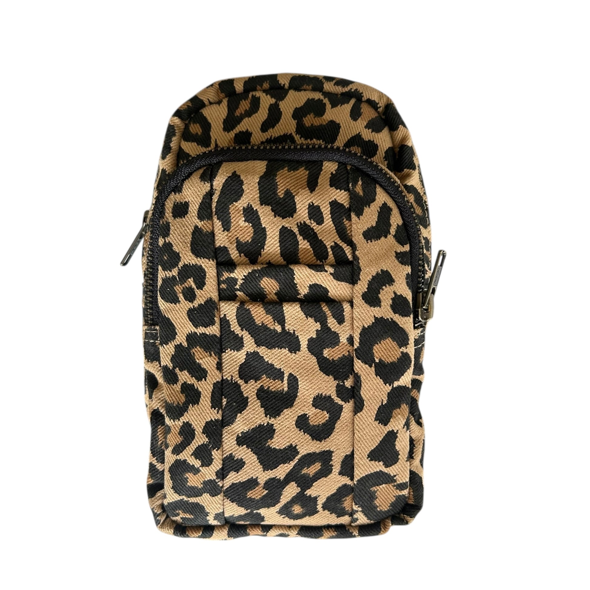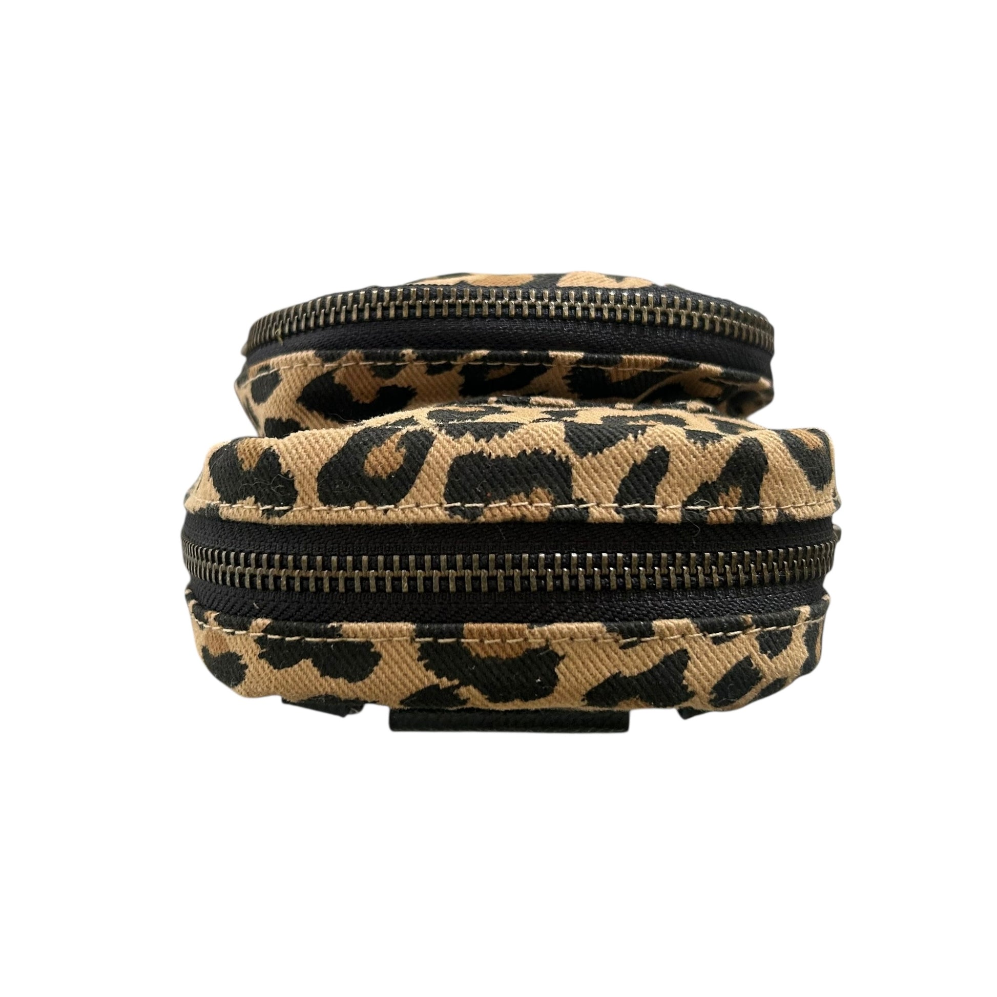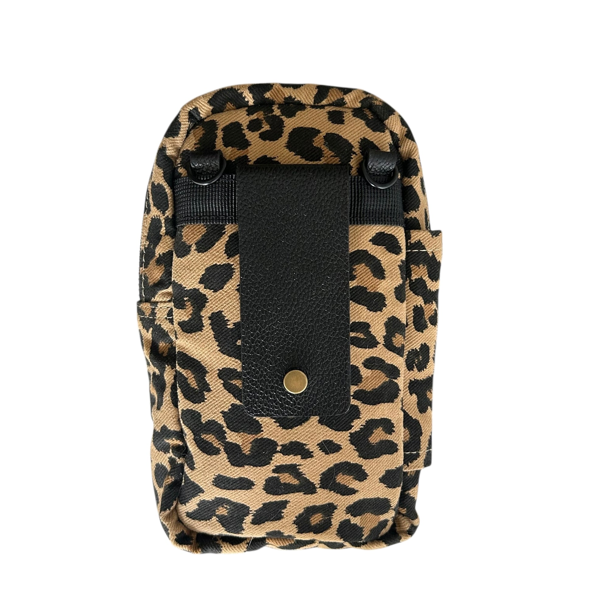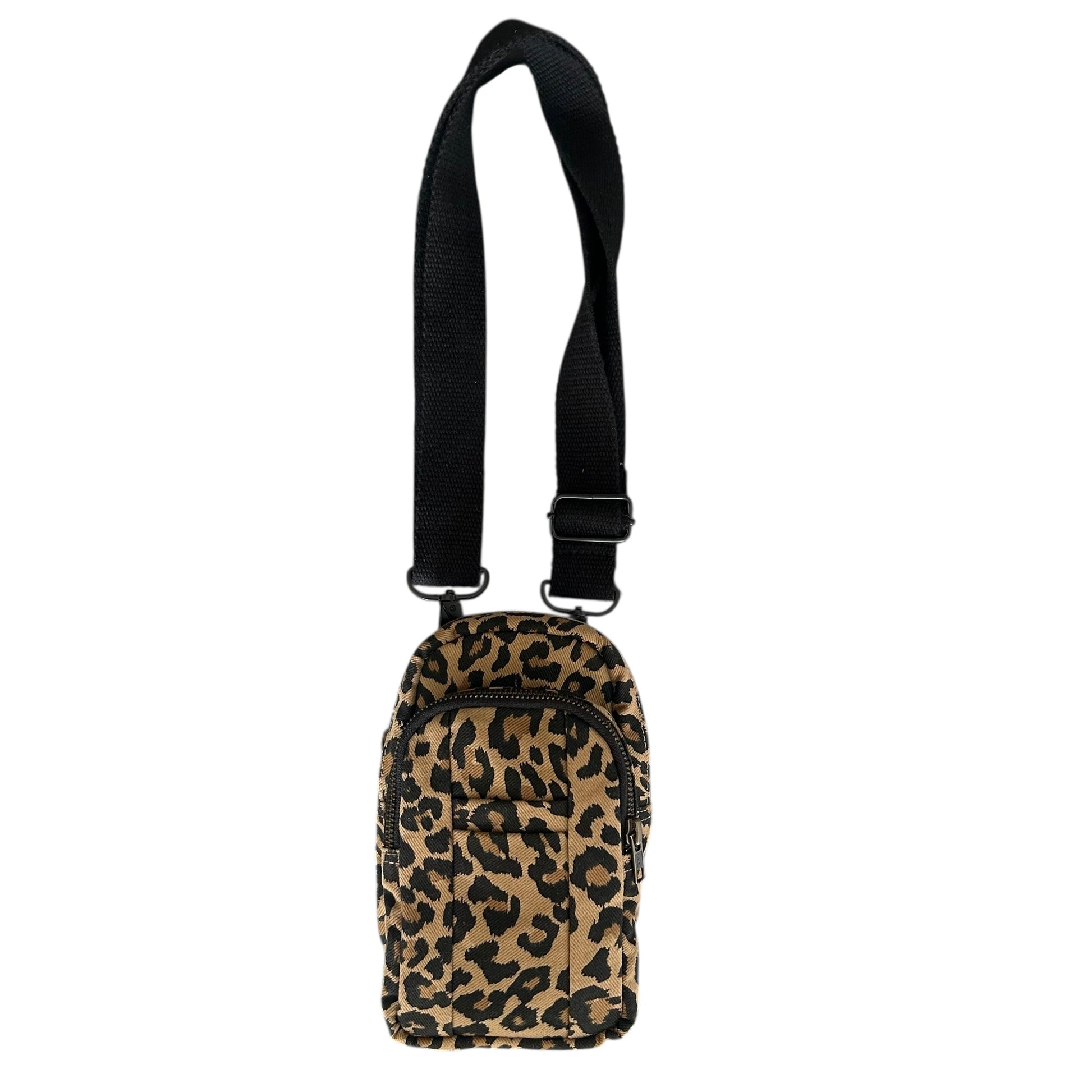 A compact bag for your essentials - in a light, sand coloured leopard print. To be worn over the shoulder or across your body. This bag also has detachable straps and can be attached to your belt.