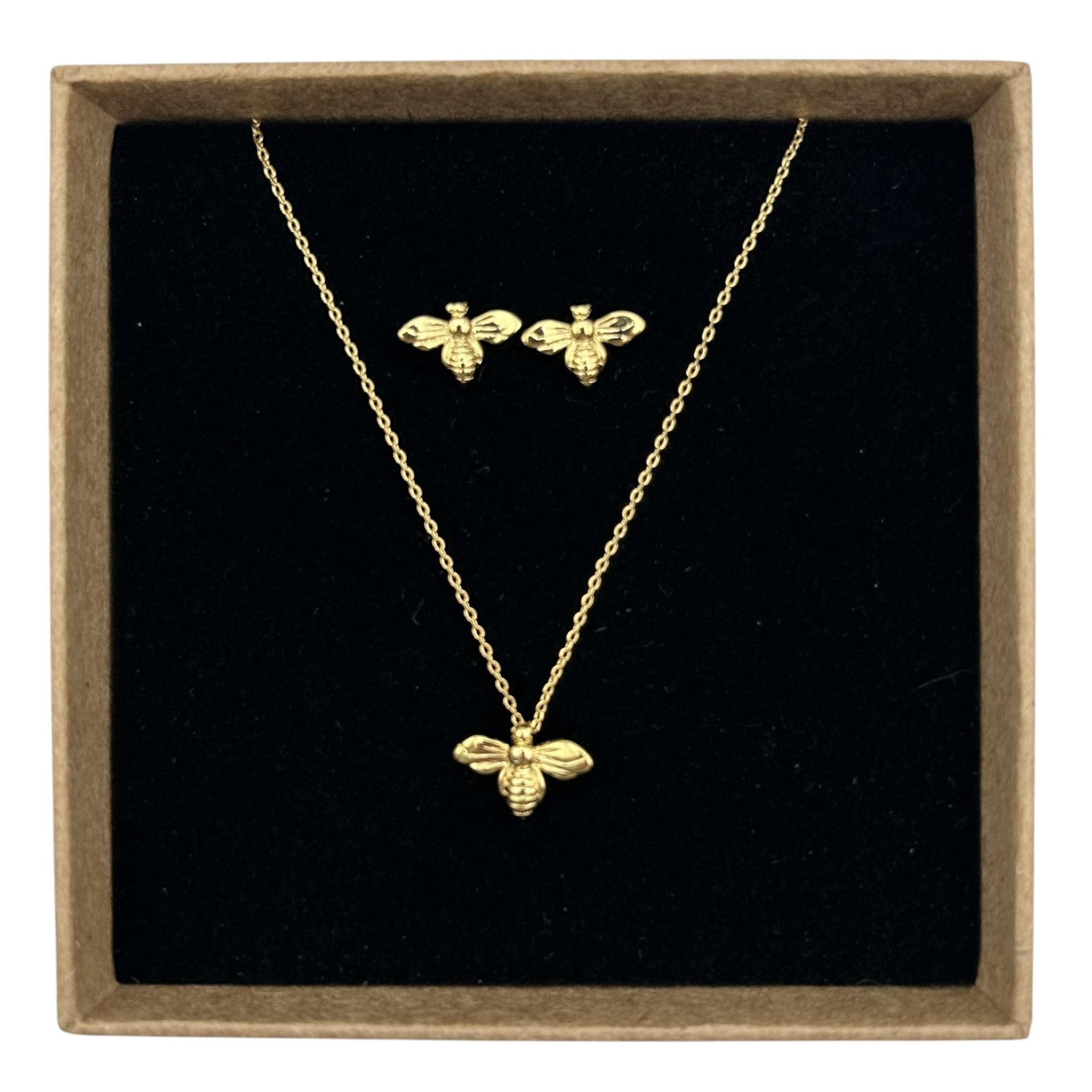 This set includes small bee pendant, on a brushed gold plated effect necklace with matching earrings.