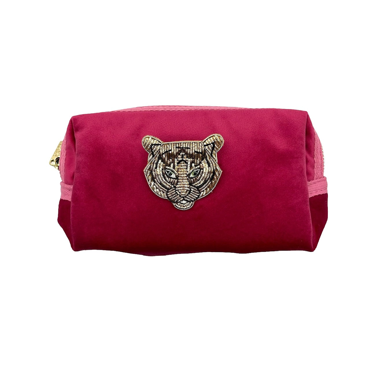 A gorgeous deep pink velvet makeup bag, with a detachable Tiger Head brooch.