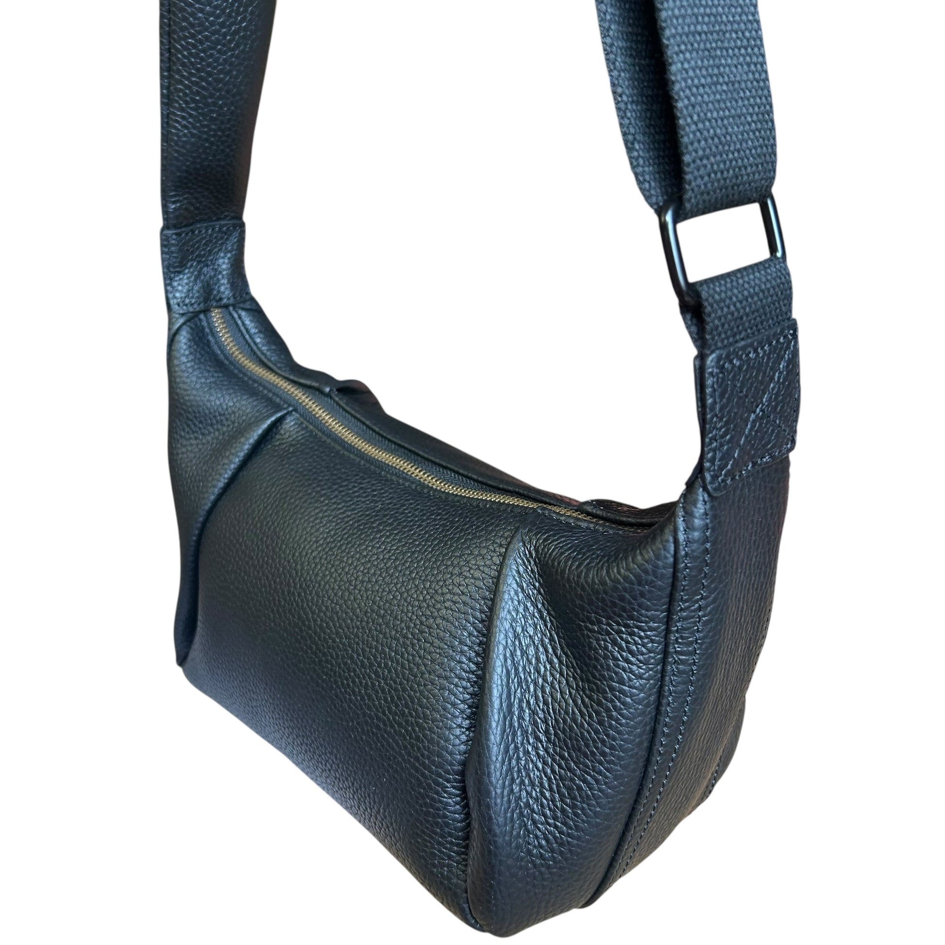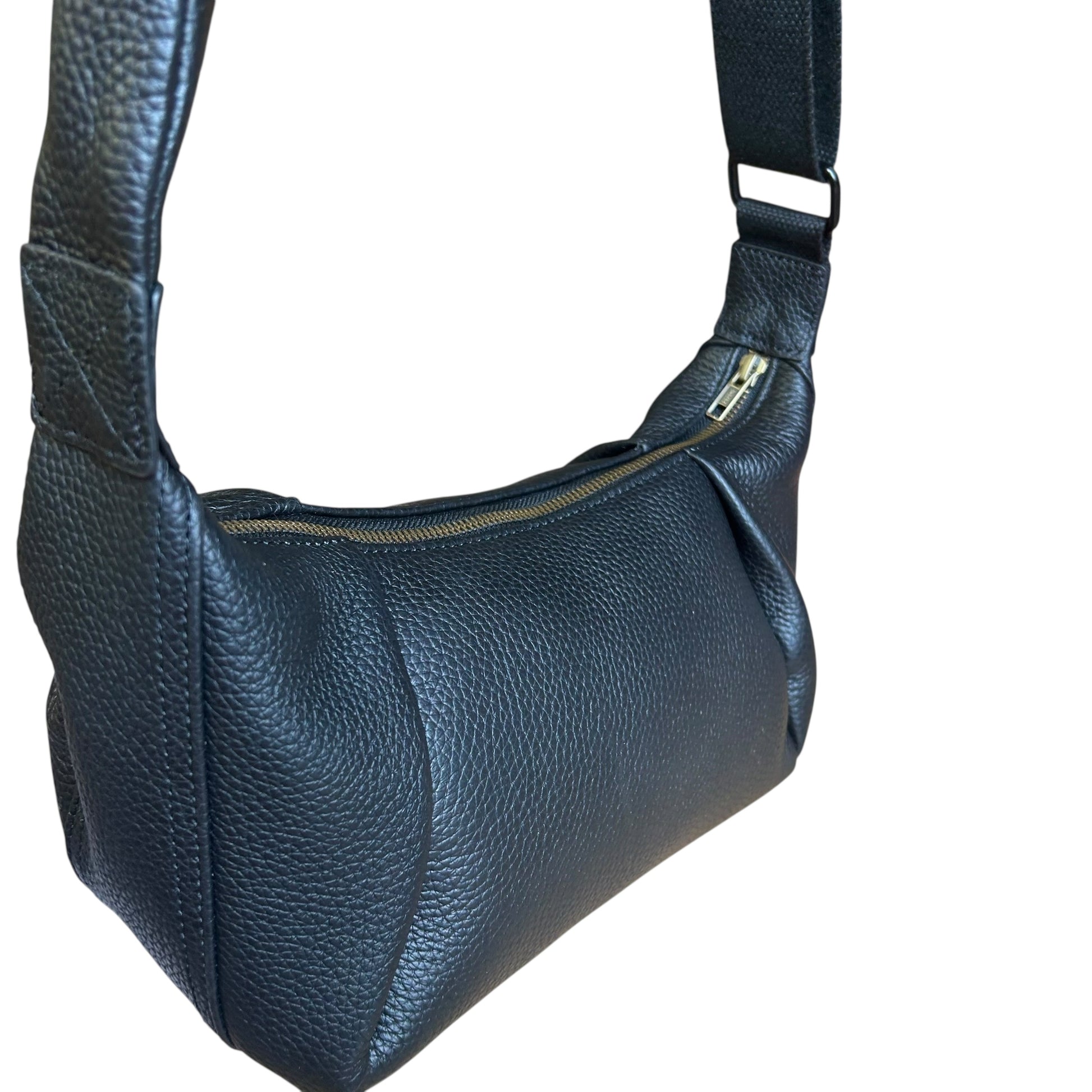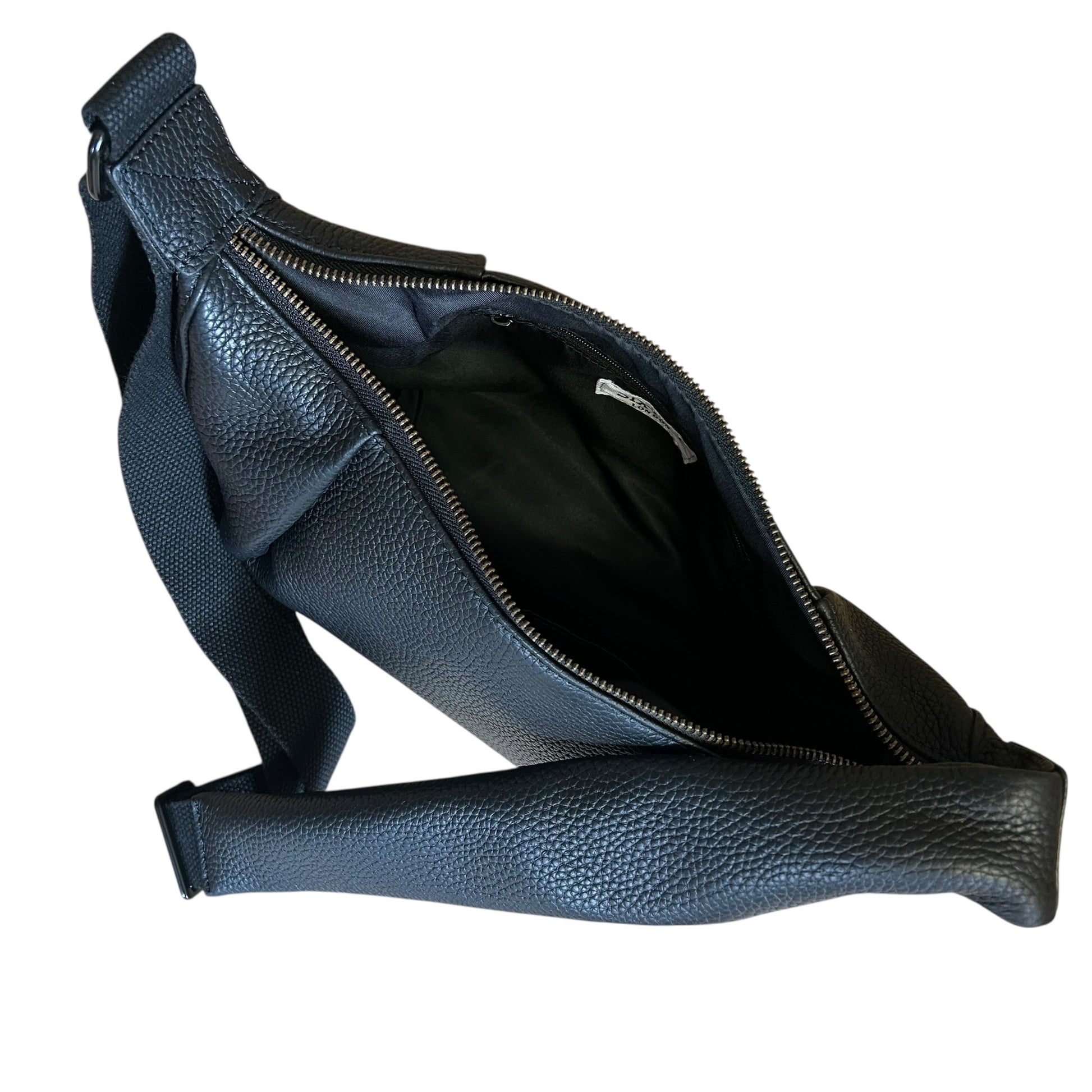 The Brixton bag in a beautiful, black textured leather. The interior features a zipped pocket.