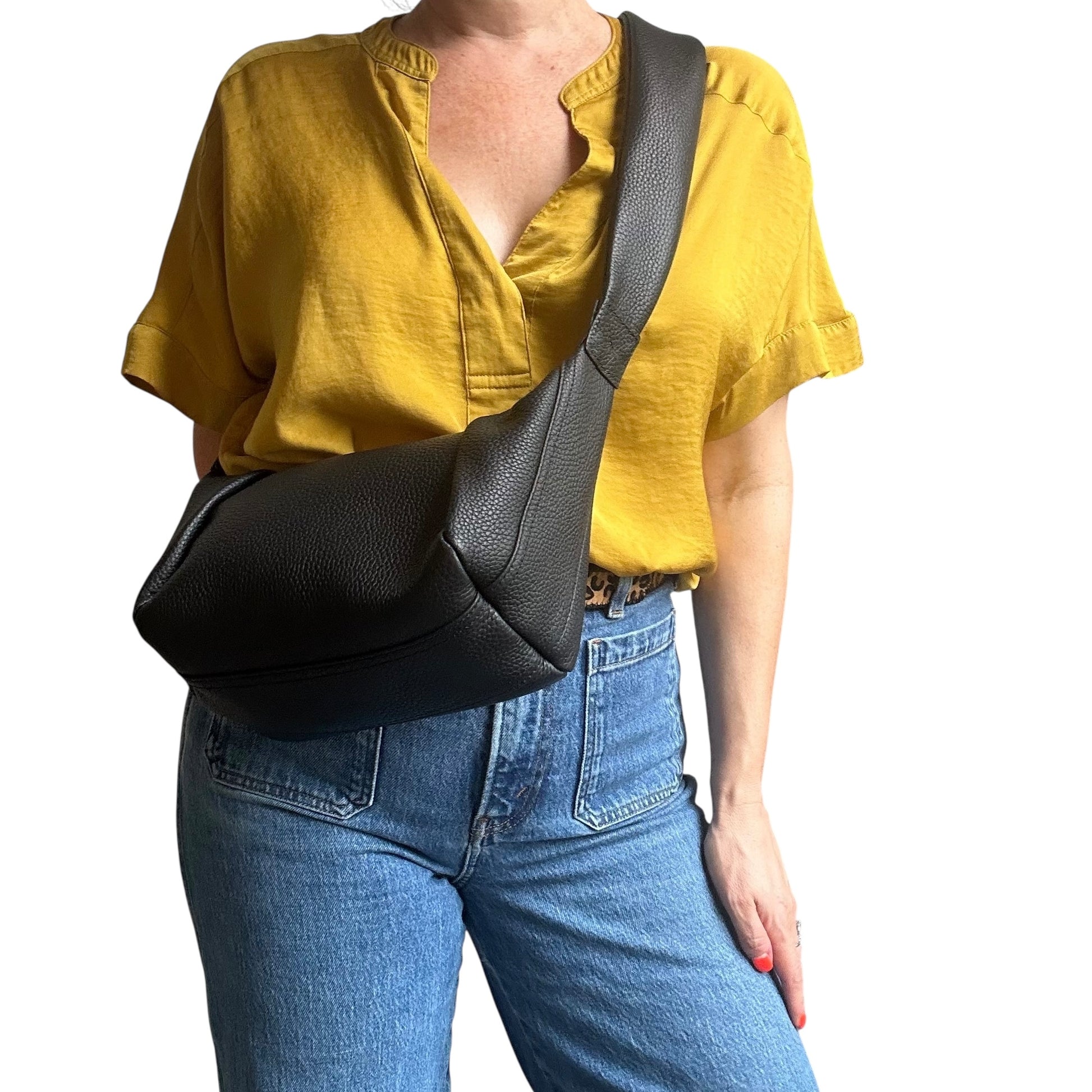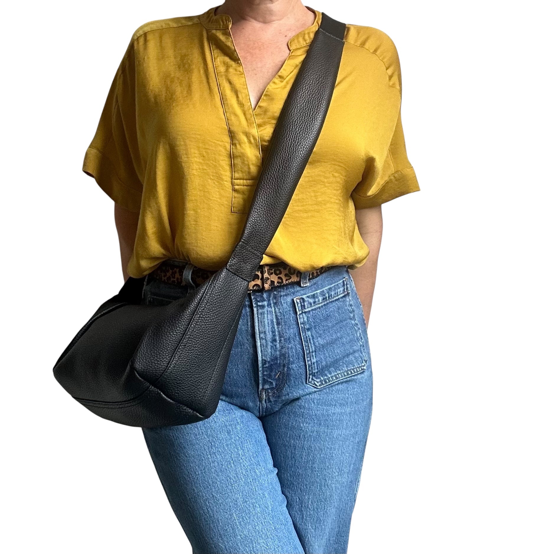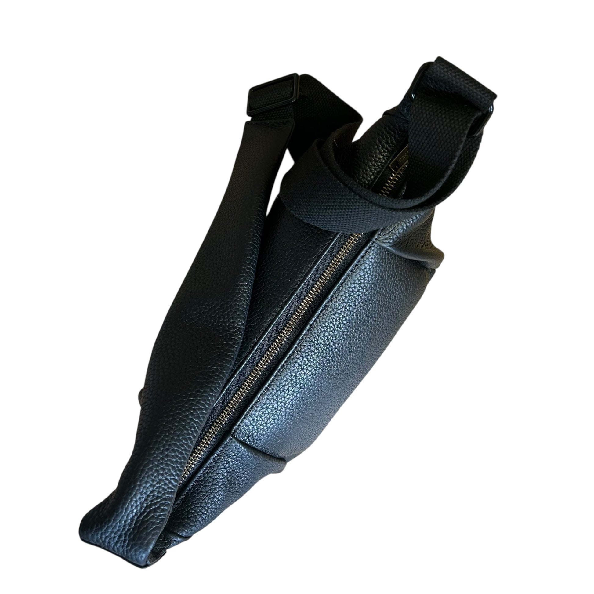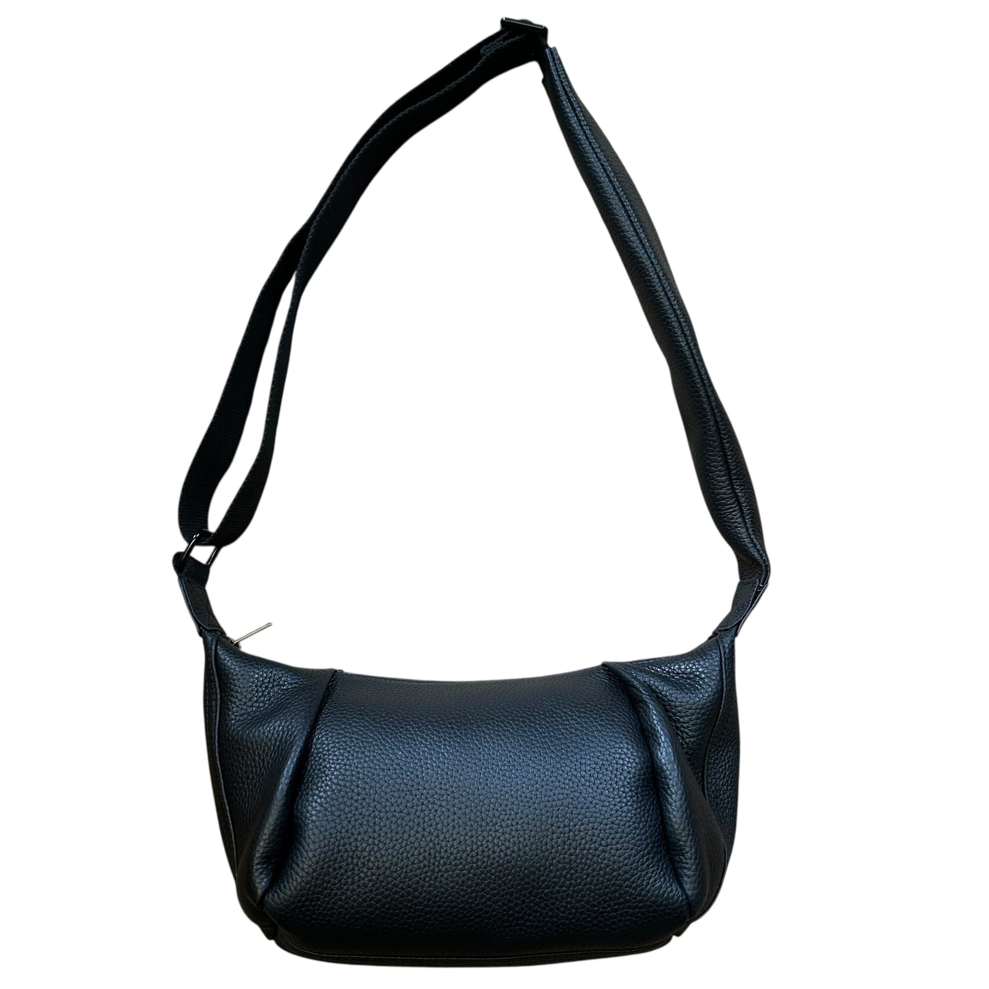 The Brixton bag in a beautiful, black textured leather. The interior features a zipped pocket.