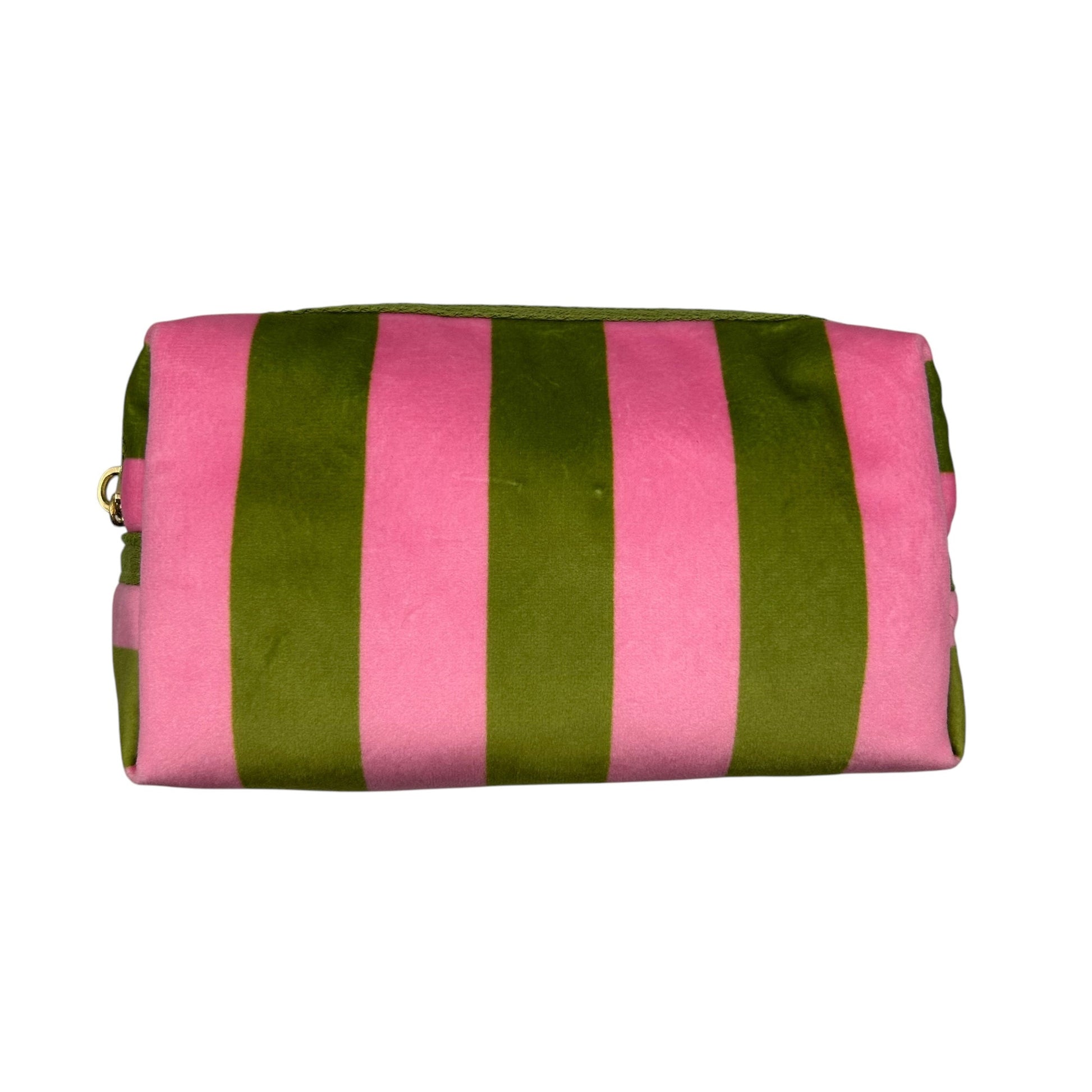 A gorgeous holiday inspired, chartreuse and pink striped velvet makeup bag.