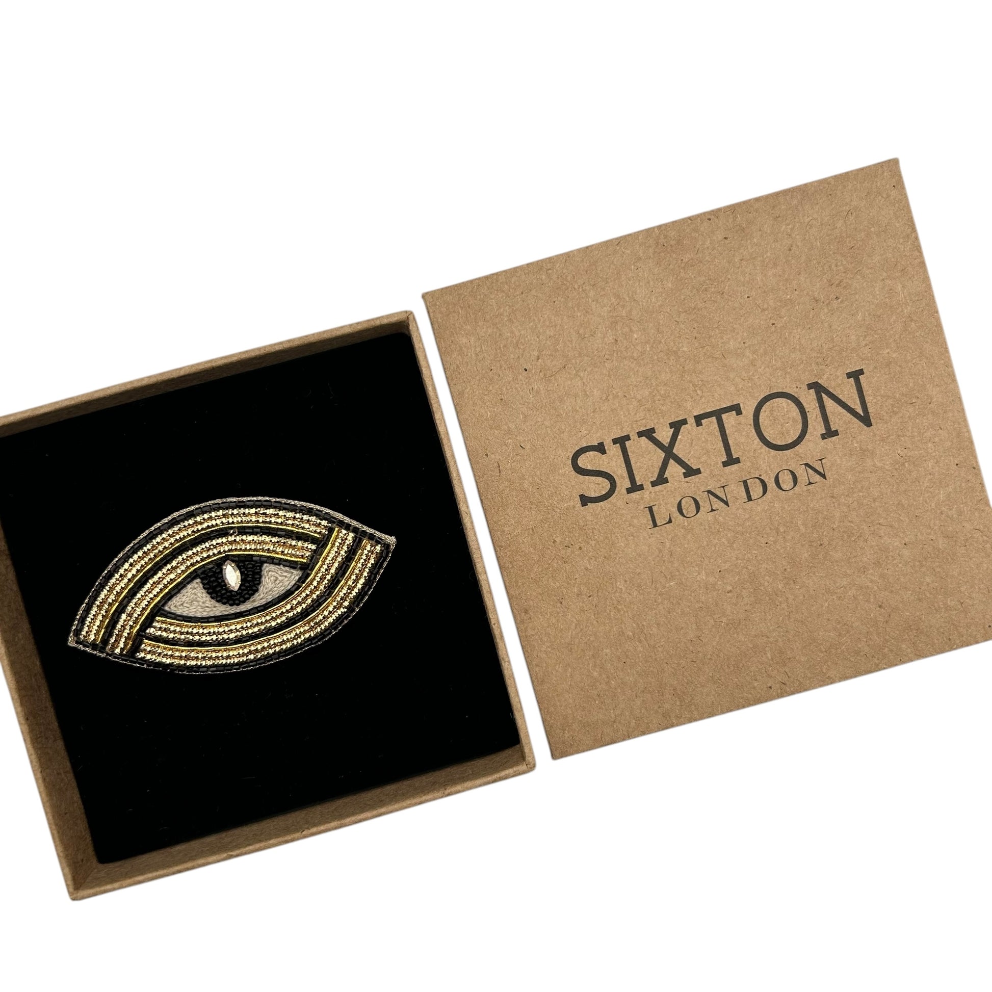 A striking, eye shaped brooch, hand embroidered with gold and black thread. The brooch comes in a recycled gift box.