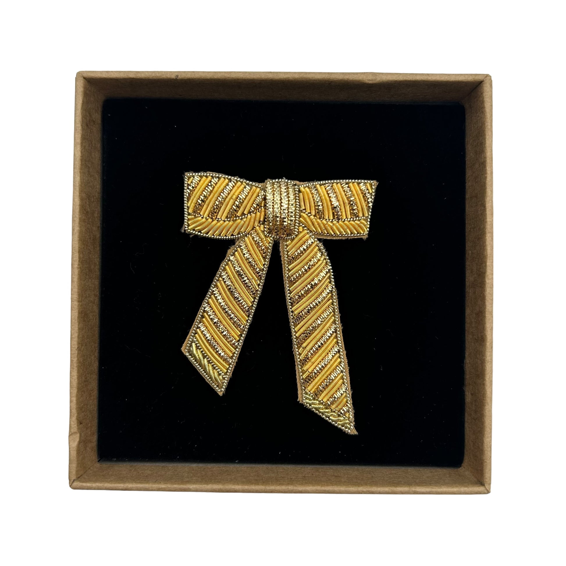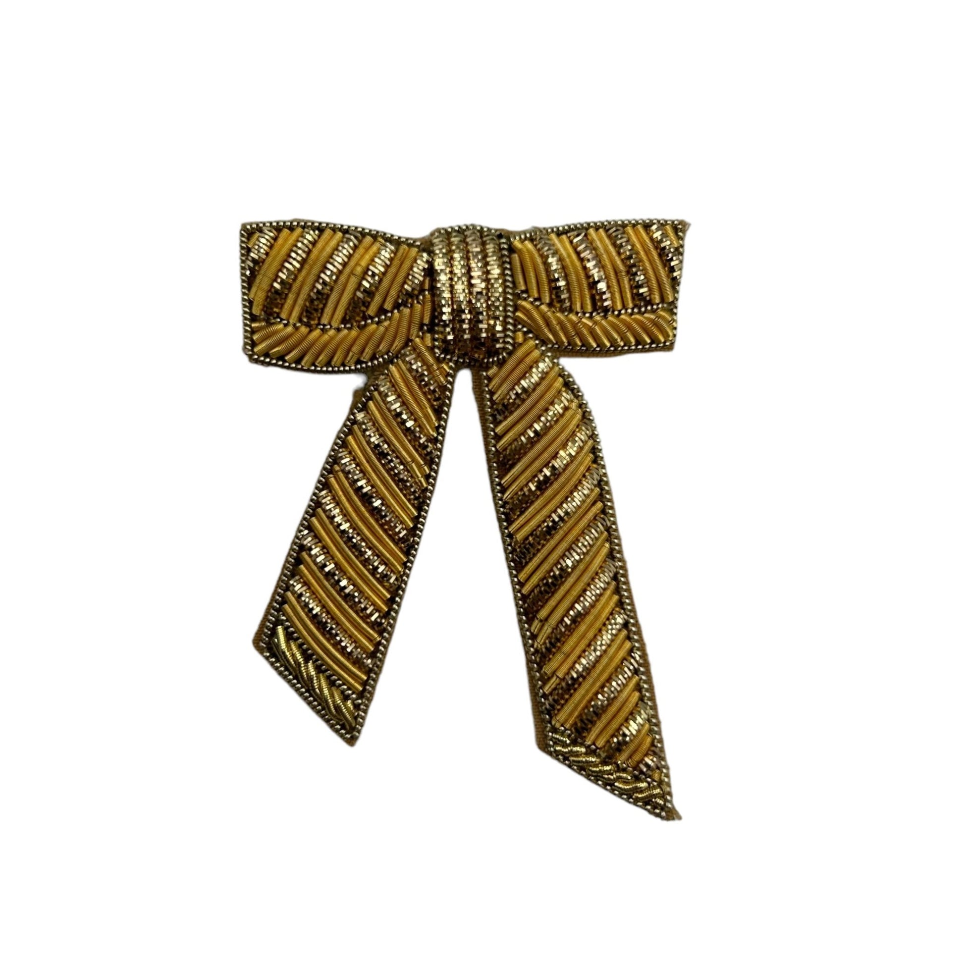 The prettiest pin! An embroidered gold bow brooch. Hand embroidered with gold-glitter thread. This stunning brooch measures 4.5cm wide and 5.5cm long.