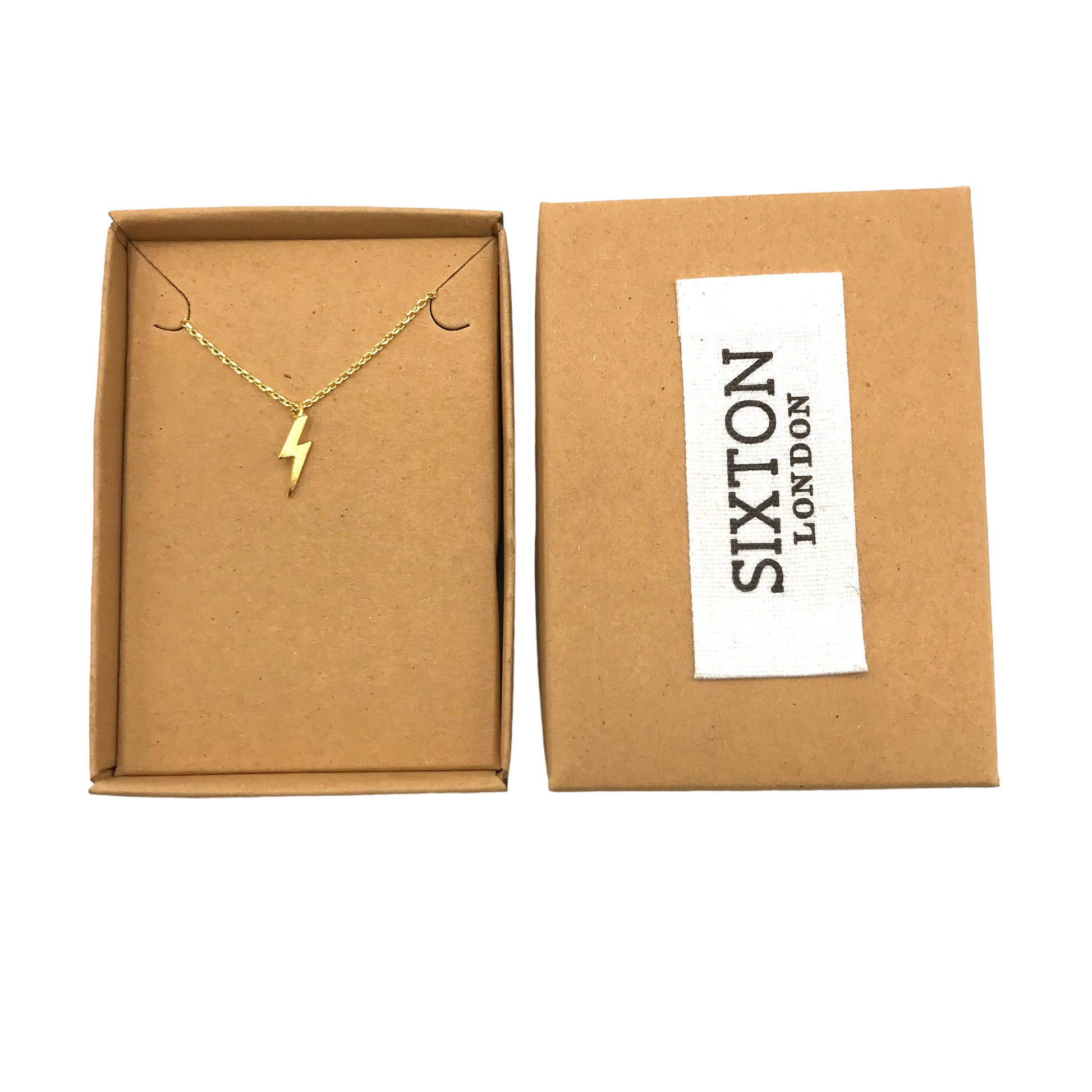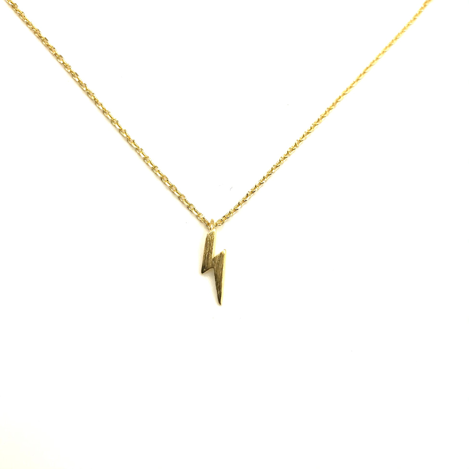 A golden lightning bolt pendant, on a brushed gold plated effect necklace.