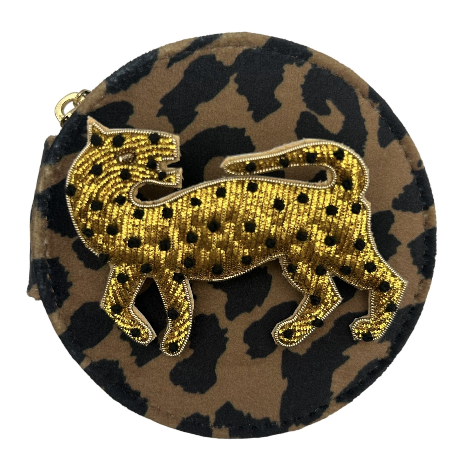 A gorgeous jewellery travel pot in a luxurious leopard print, made from recycled materials, with a detachable Leopard brooch.