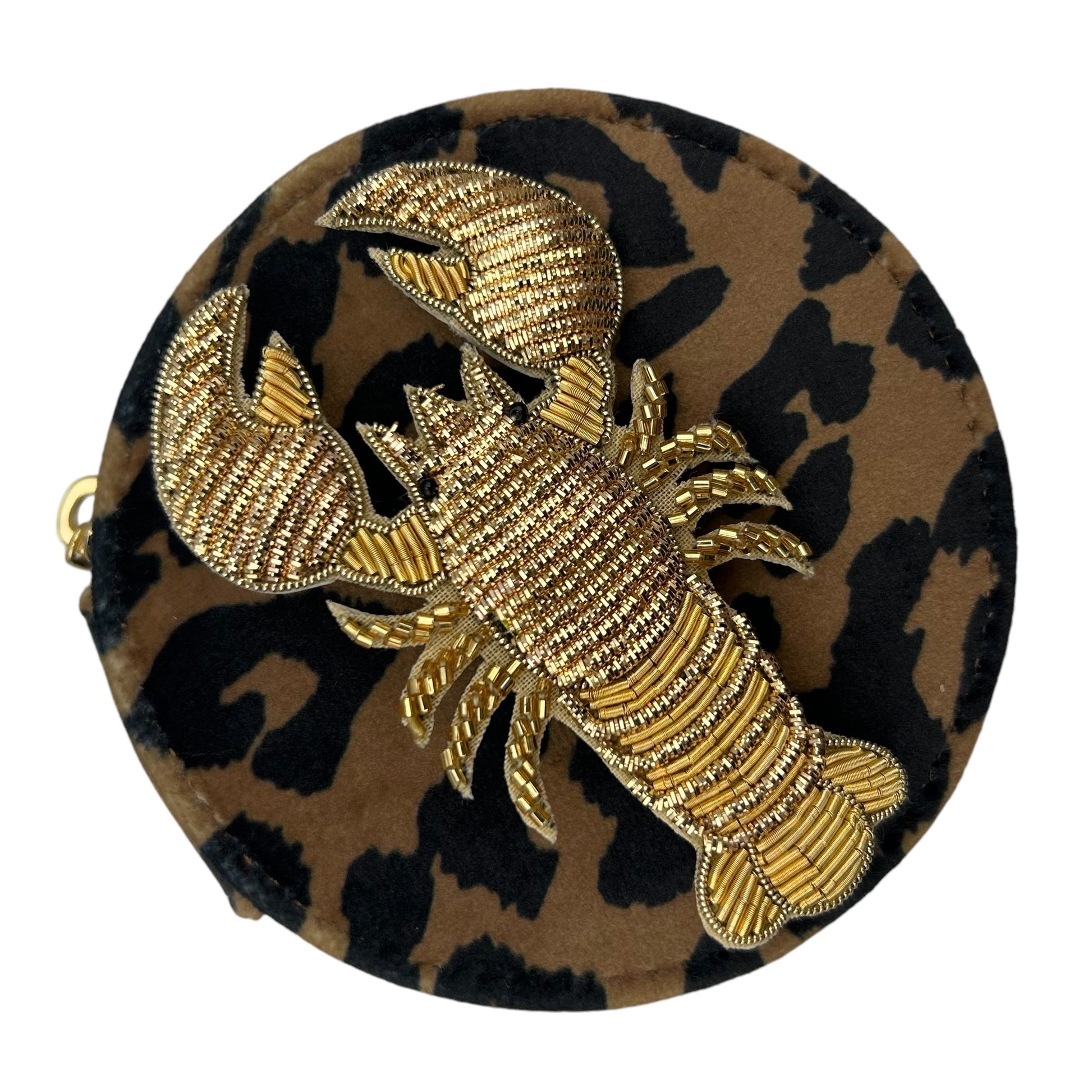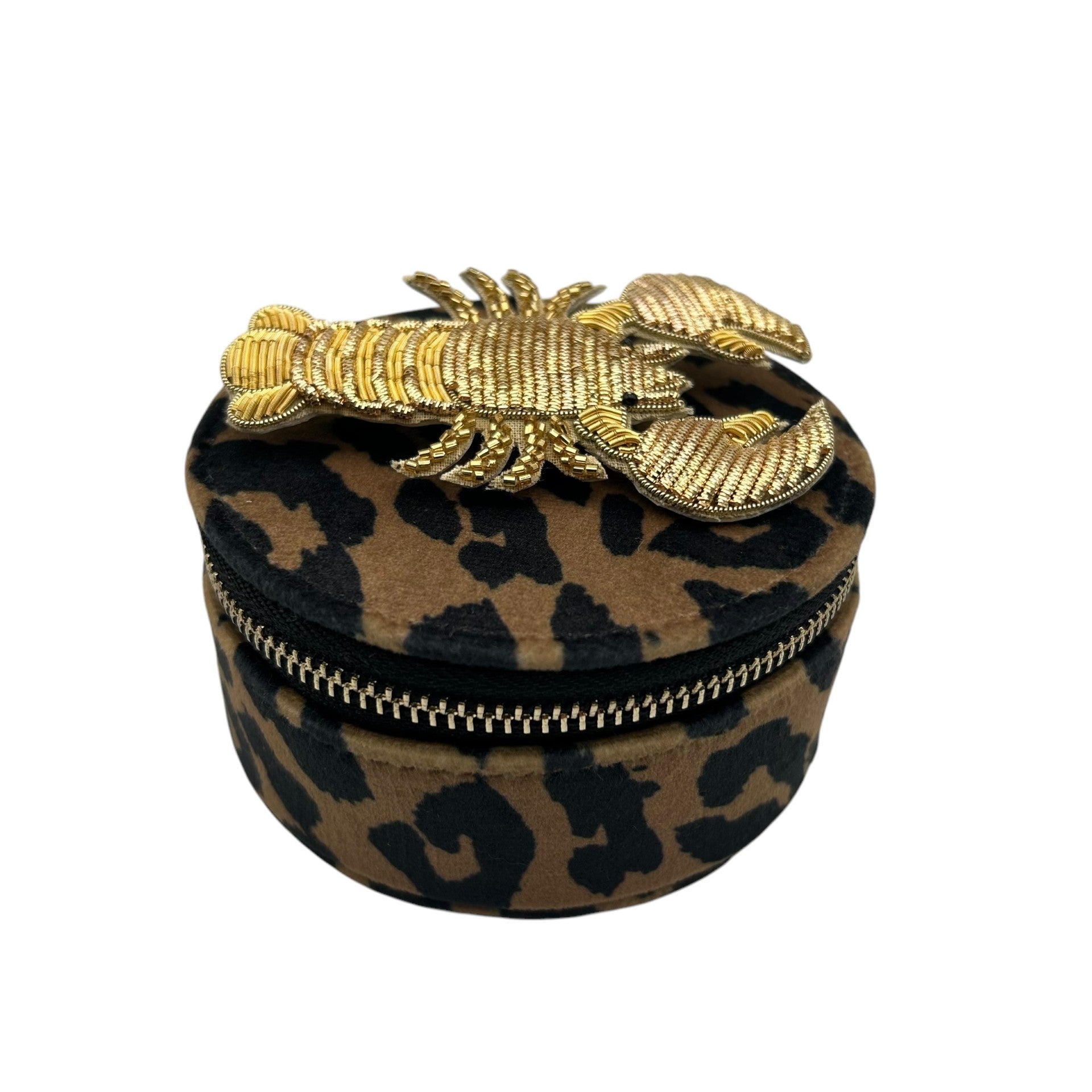 A gorgeous jewellery travel pot in a luxurious leopard print, made from recycled materials, with a detachable Lobster brooch.