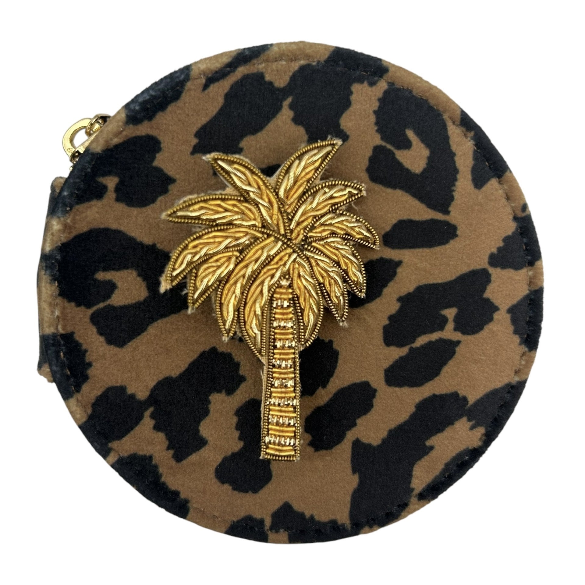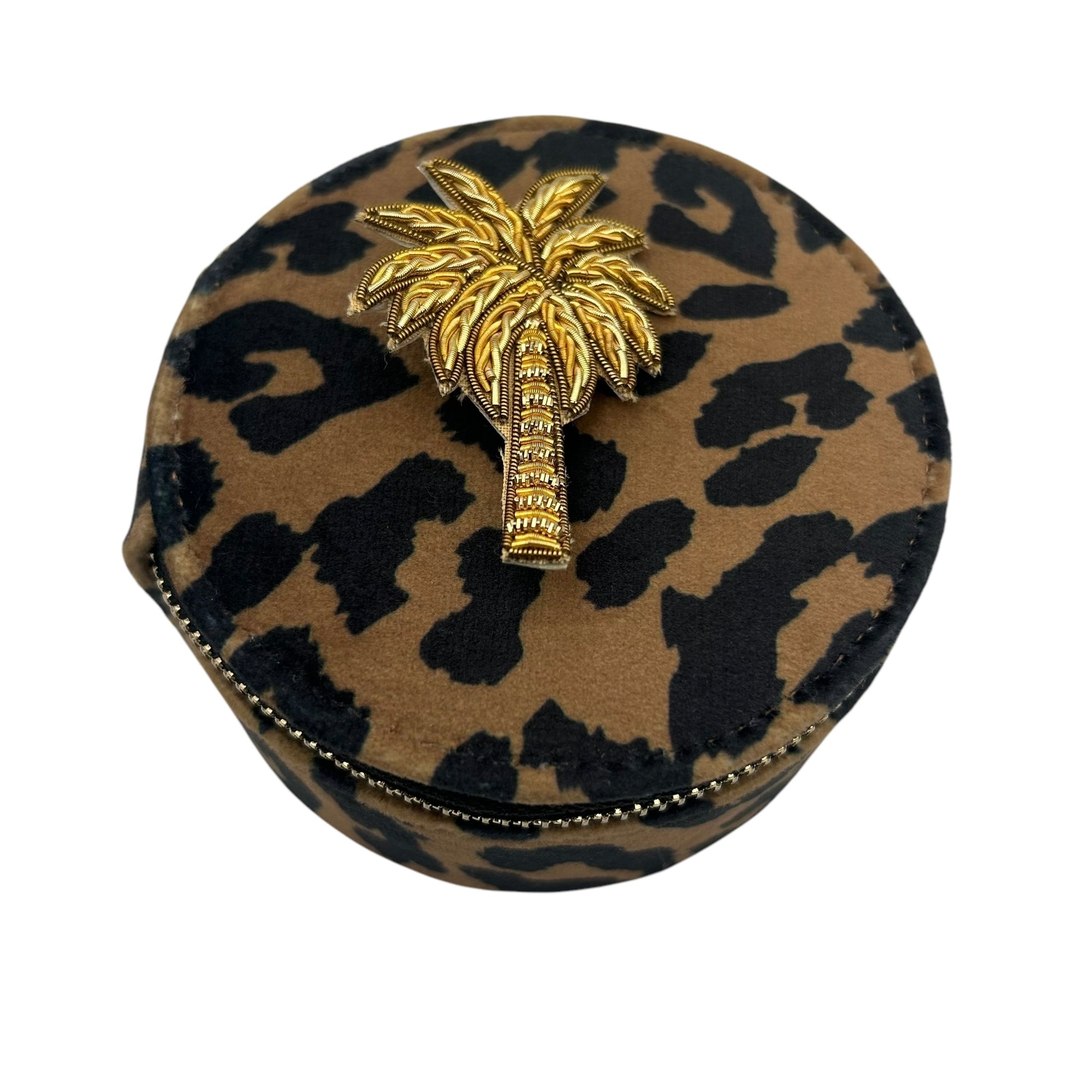 A gorgeous jewellery travel pot in a luxurious leopard print, made from recycled materials, with a detachable Palm Tree brooch.