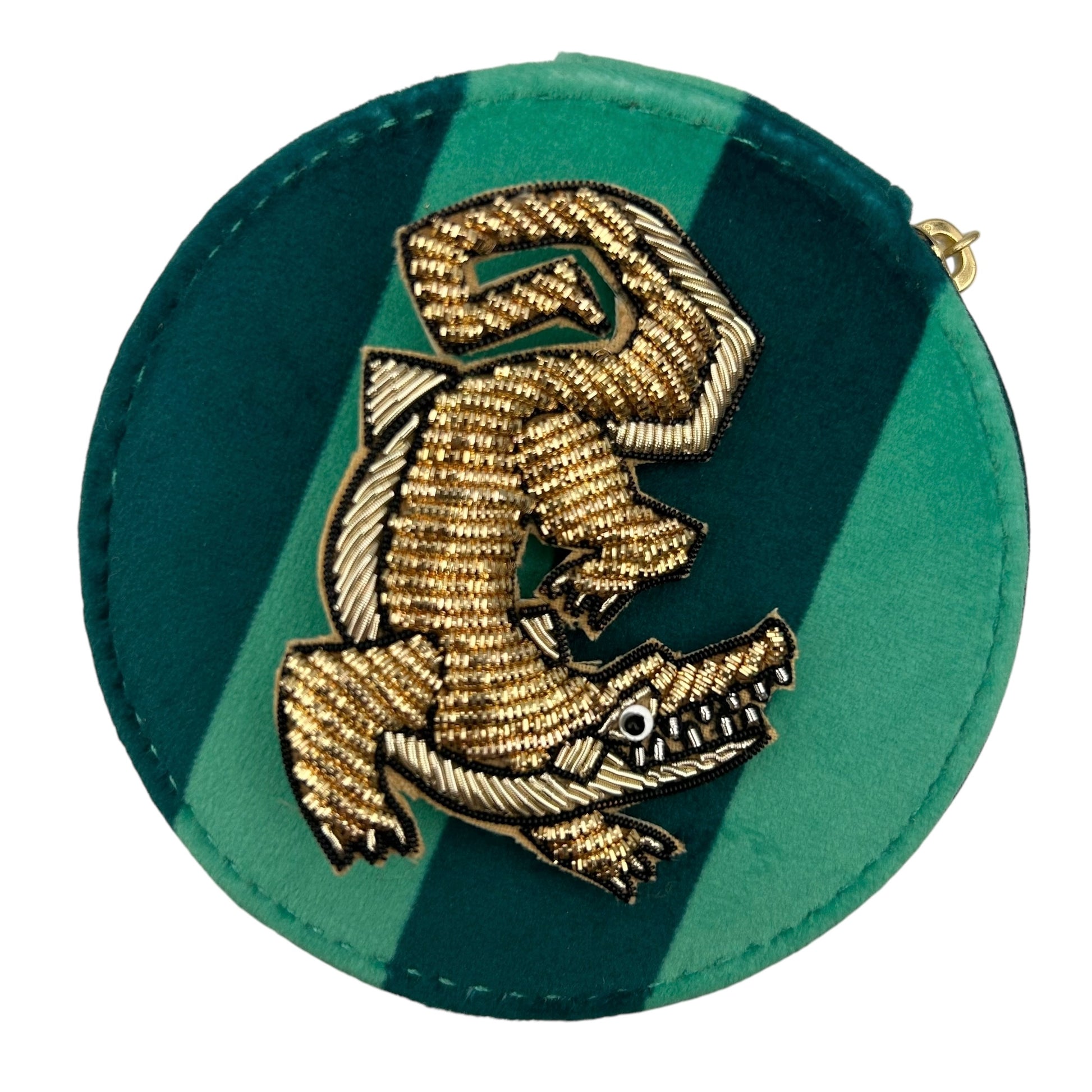 Jewellery Travel Pot in teal stripe - Crocodile brooch