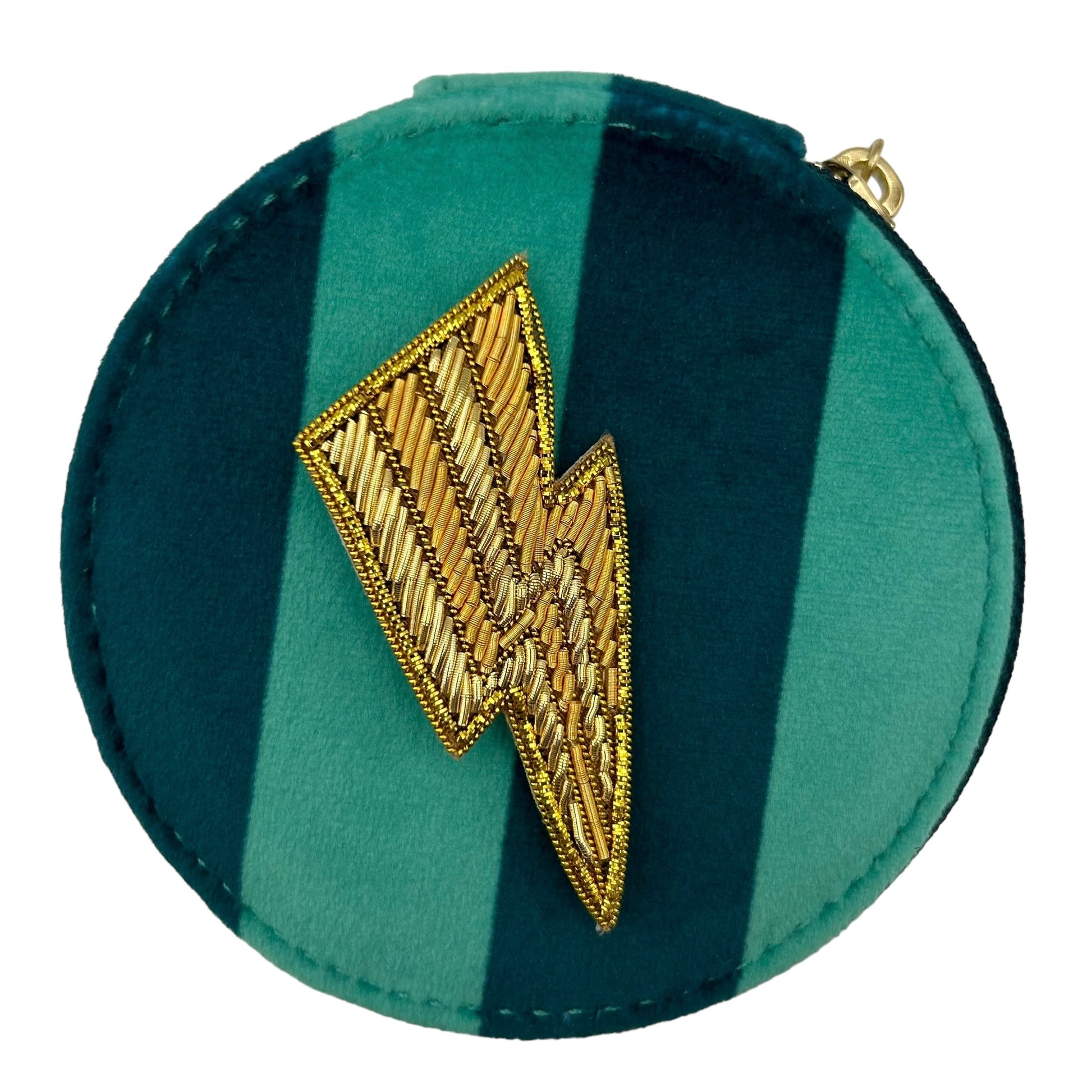A gorgeous, teal and marine, striped jewellery travel pot, made from recycled materials, with a hand embroidered, lightning bolt brooch.