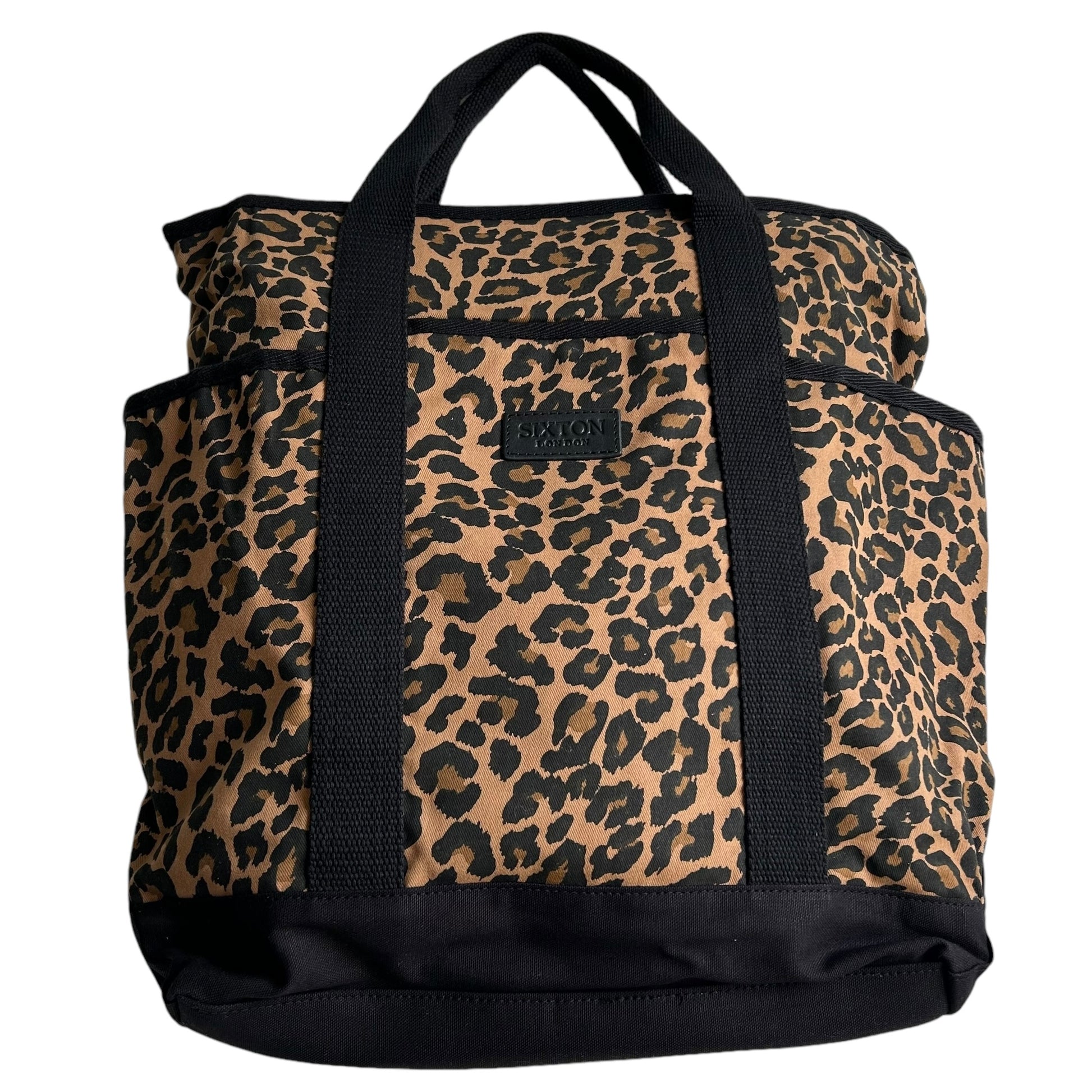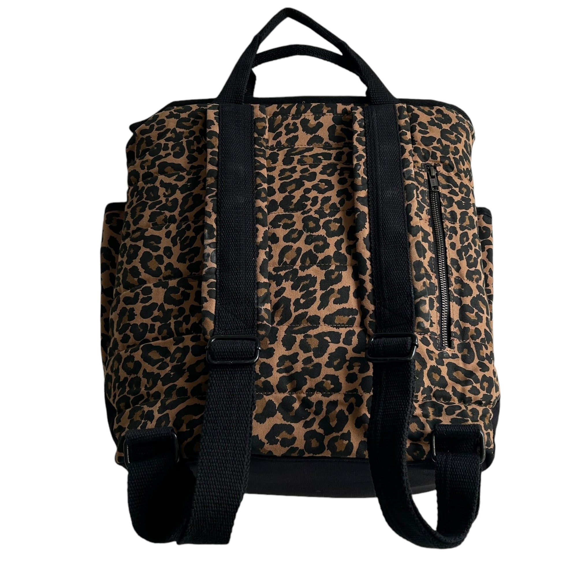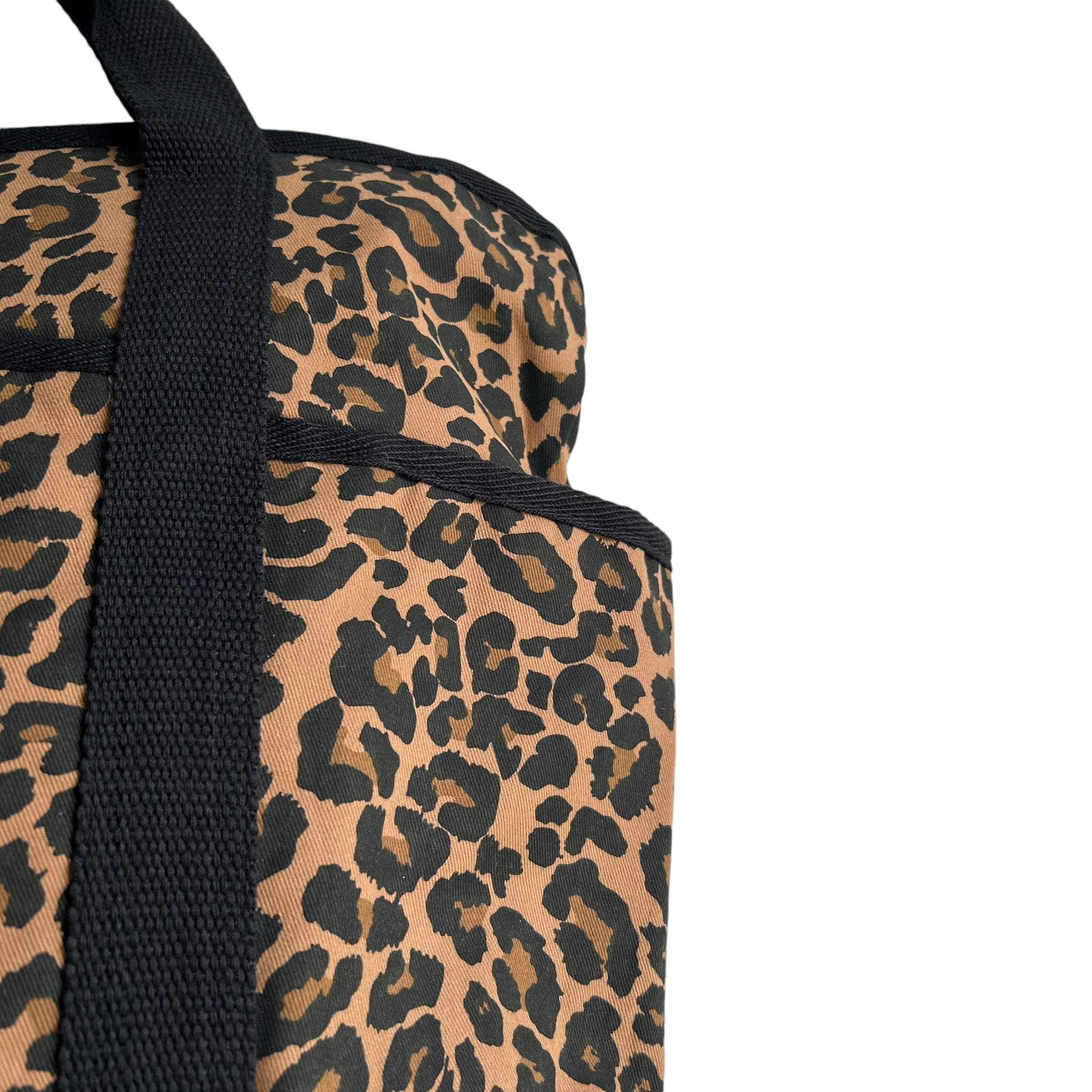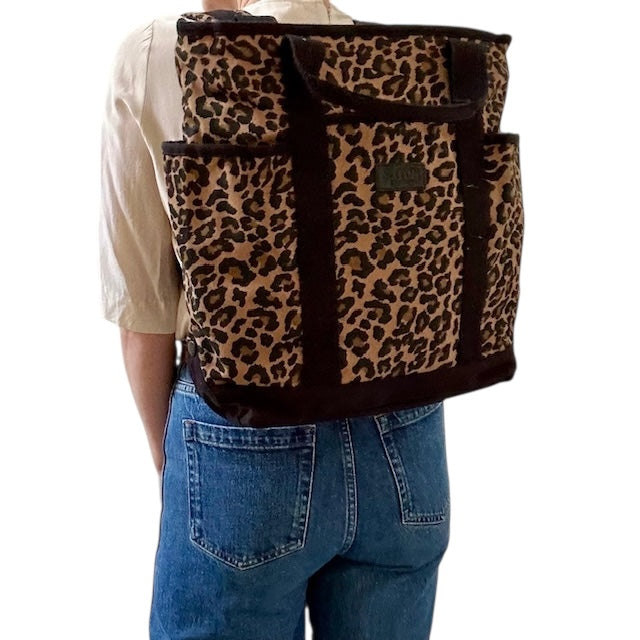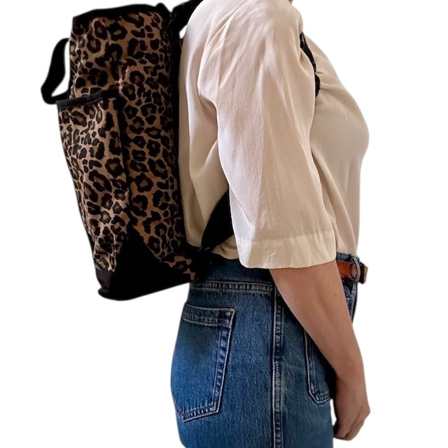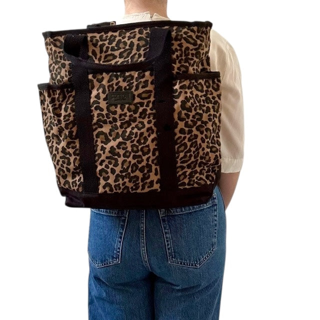 A statement backpack in a striking, dark brown leopard print, made from recycled cotton. Also available in Sand Leopard print.