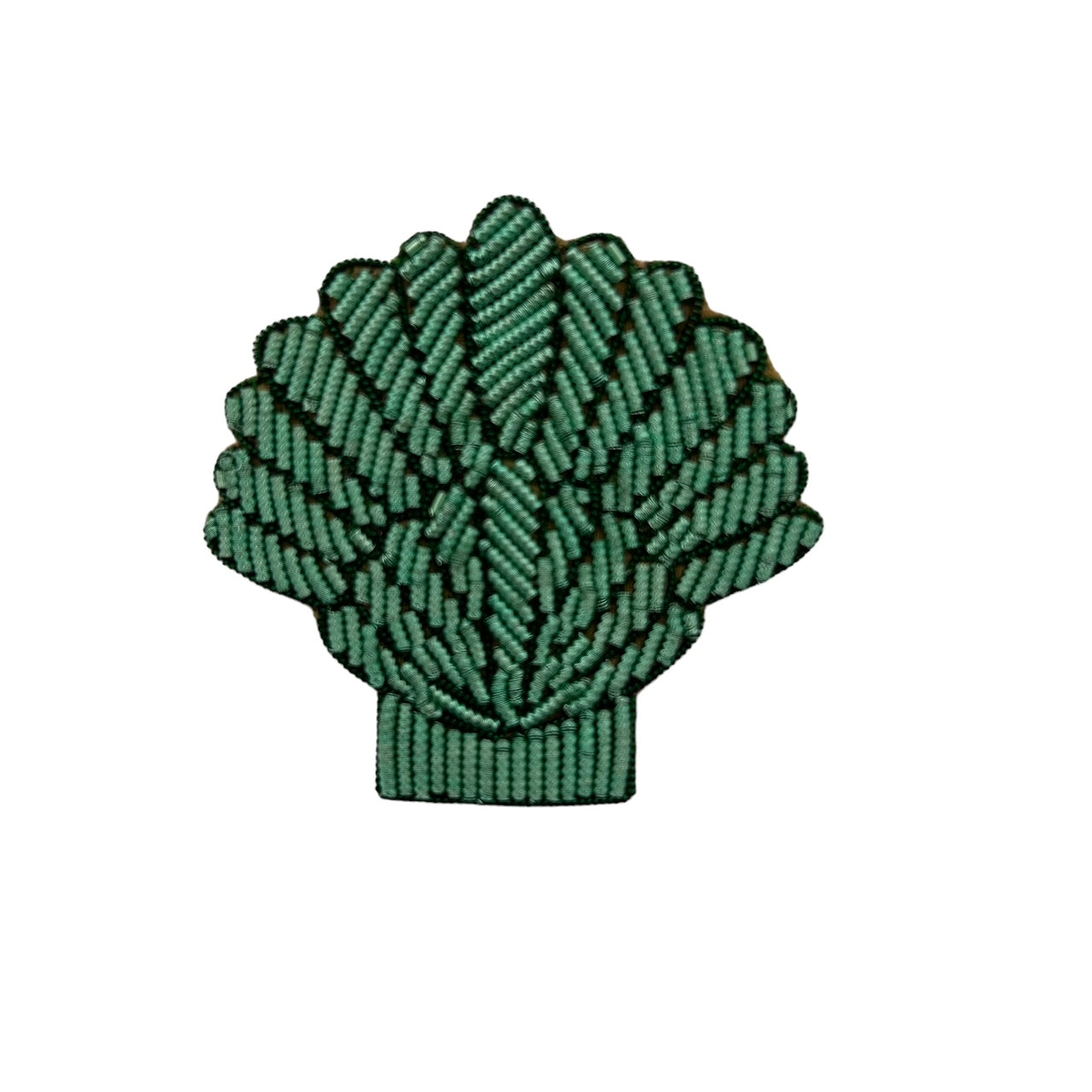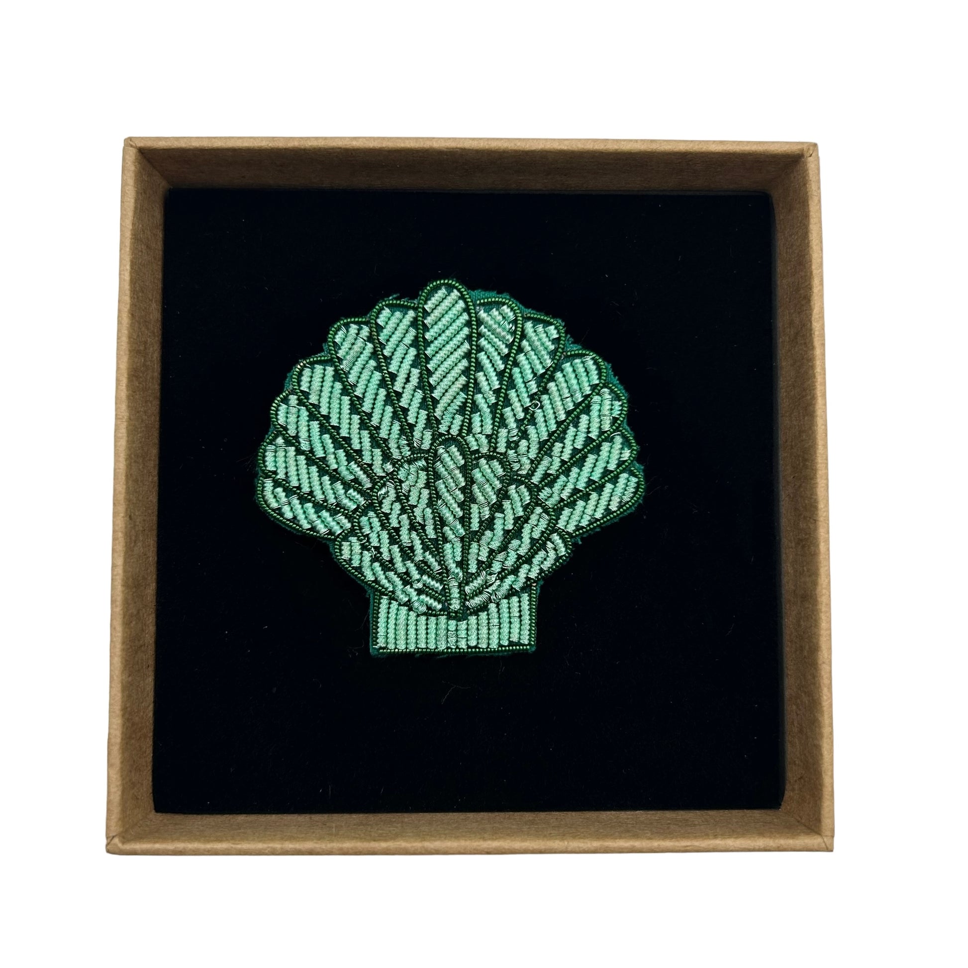 An embroidered, mint shell brooch. This beautiful pin measures 5cm across and 5cm from top to bottom.