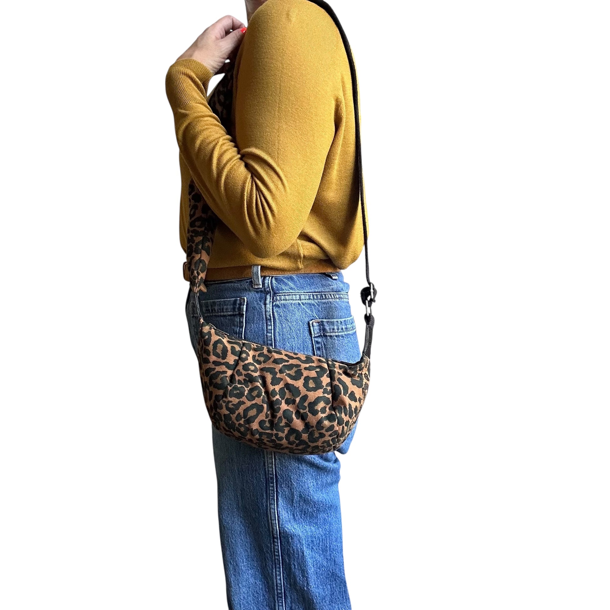 A super small version of our best selling Brixton, cross body style sling bag in a striking brown leopard print, made from water resistant, recycled cotton canvas.