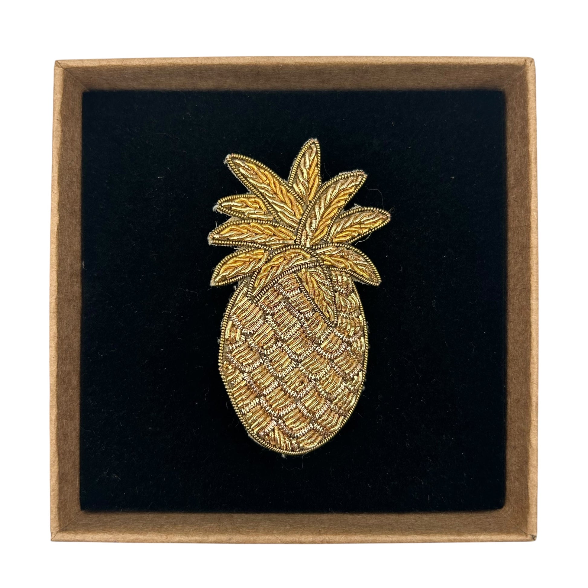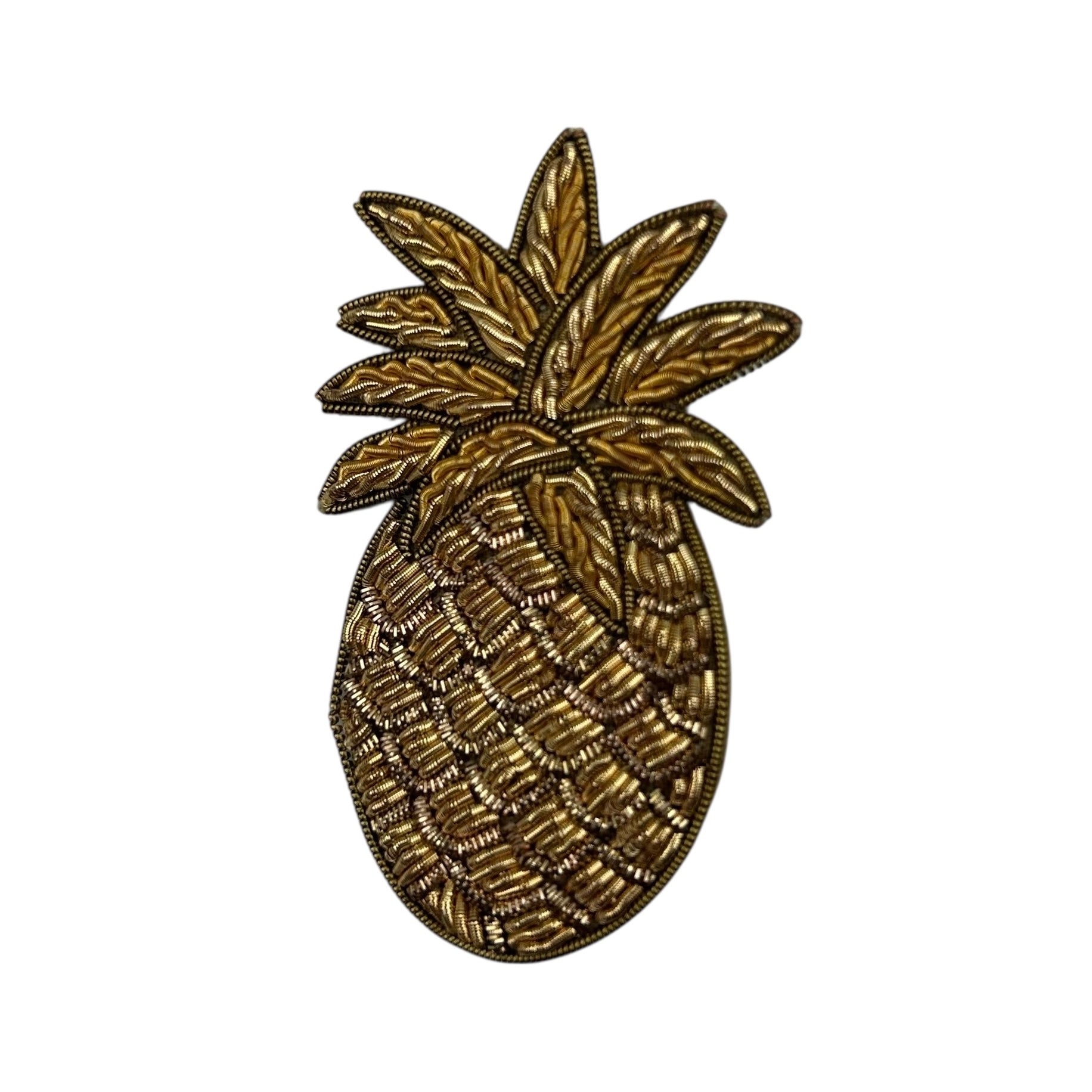 A beautiful handmade, embroidered pineapple brooch. Add this striking pin to style your coat or top.