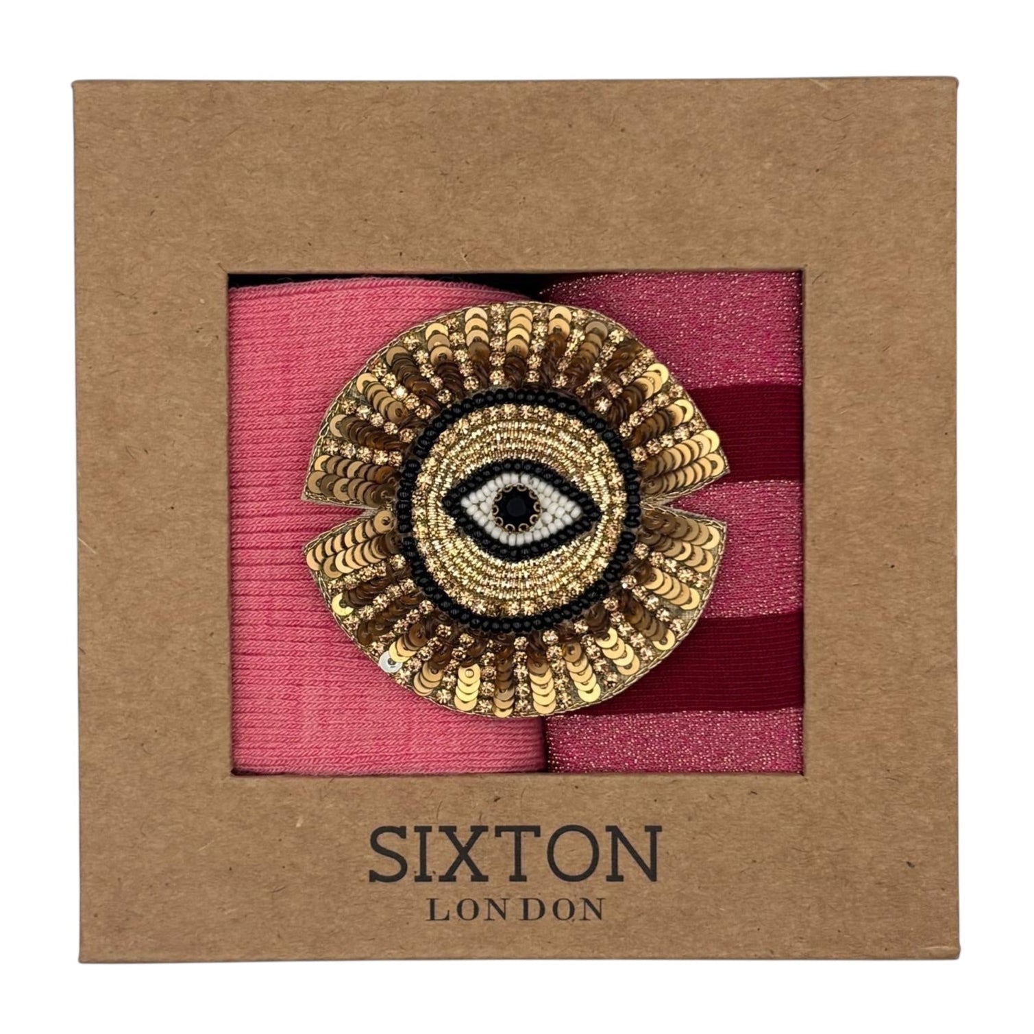 Pink Barcelona & Red Berlin sock box duo with embroidered brooch