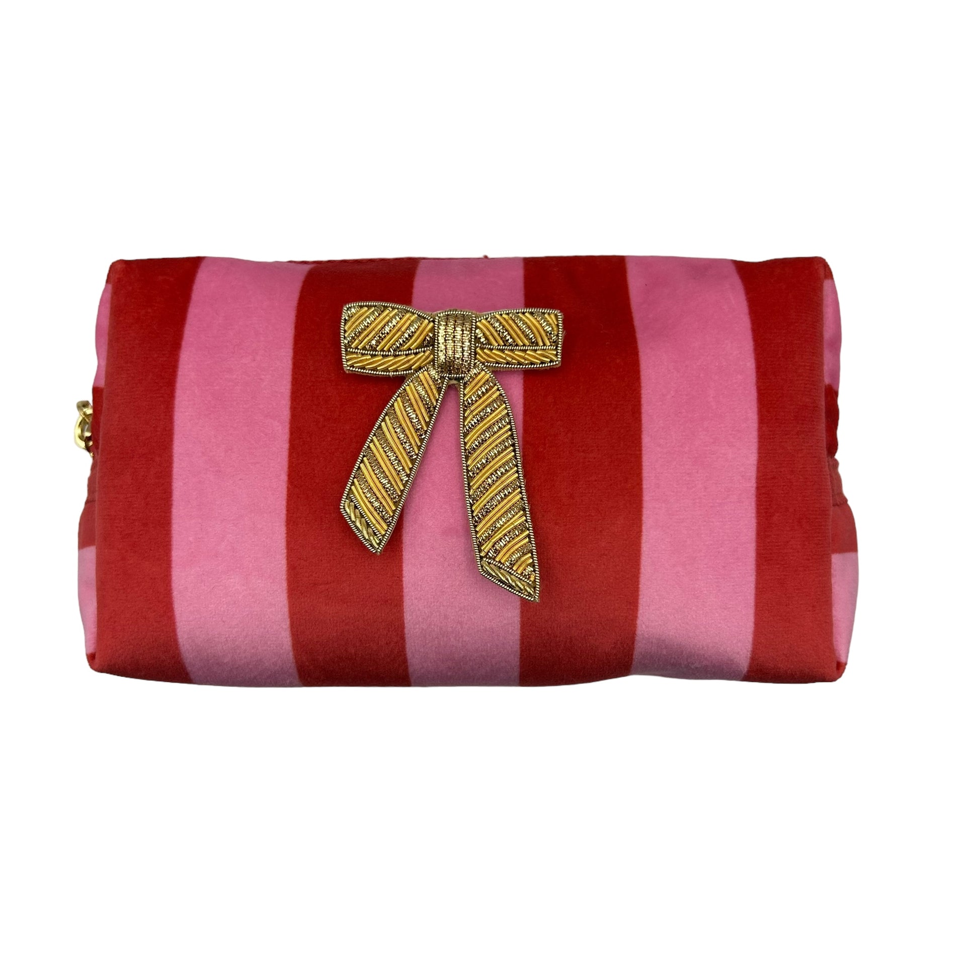 A gorgeous pink and red stripe velvet makeup bag, with a detachable Gold Bow brooch.