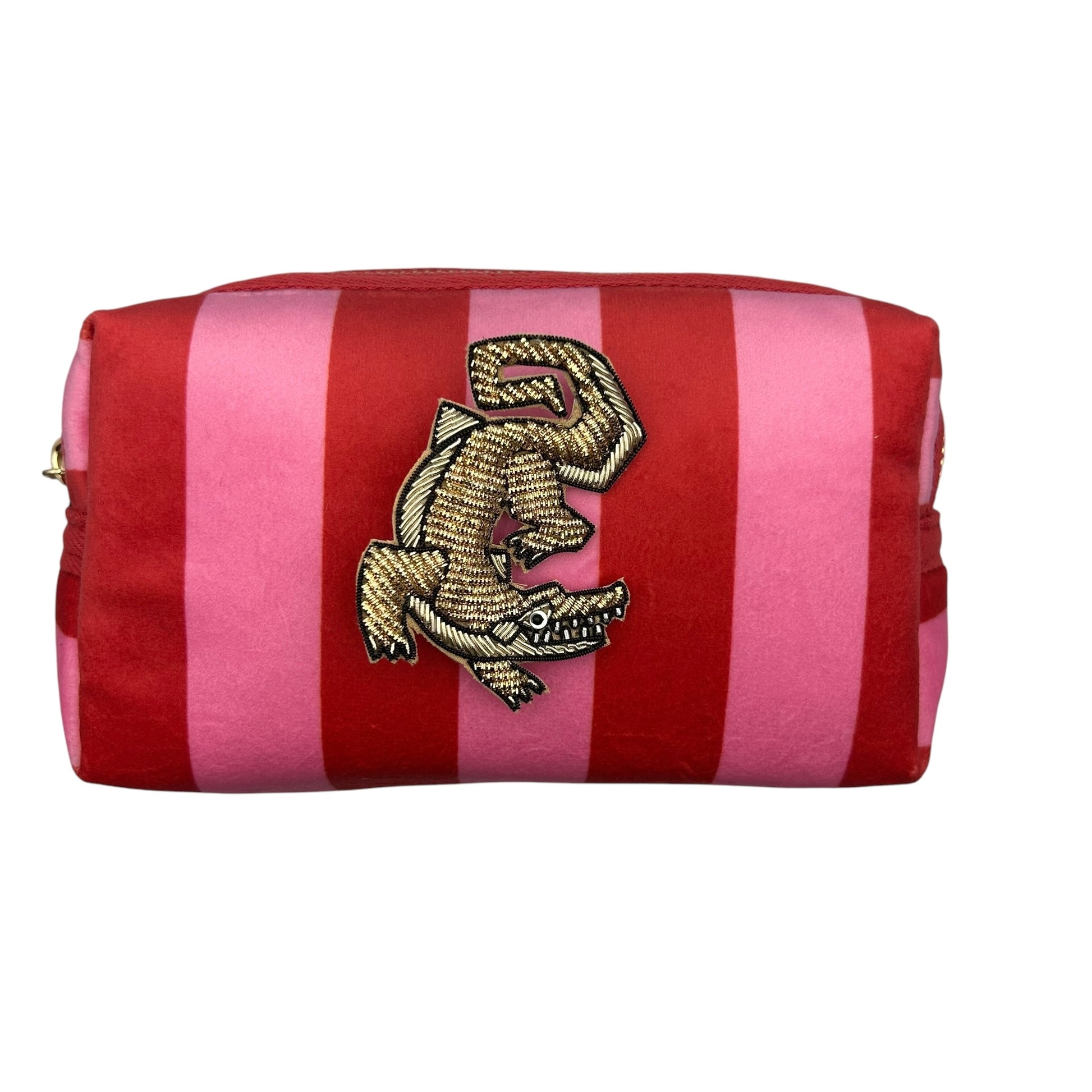 A gorgeous pink and red stripe velvet makeup bag, with a detachable Crocodile brooch.