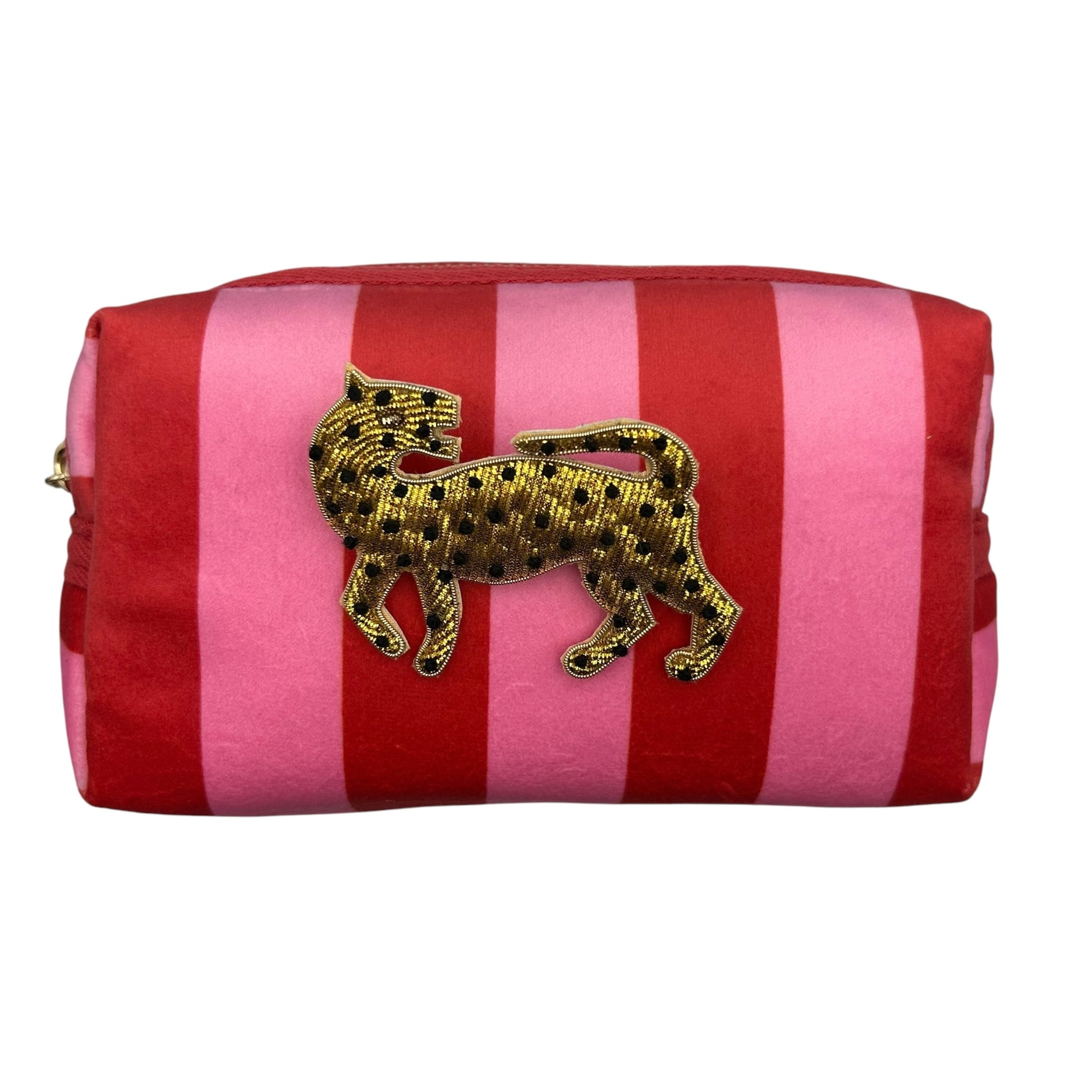 A gorgeous pink and red stripe velvet makeup bag, with a detachable Leopard brooch.
