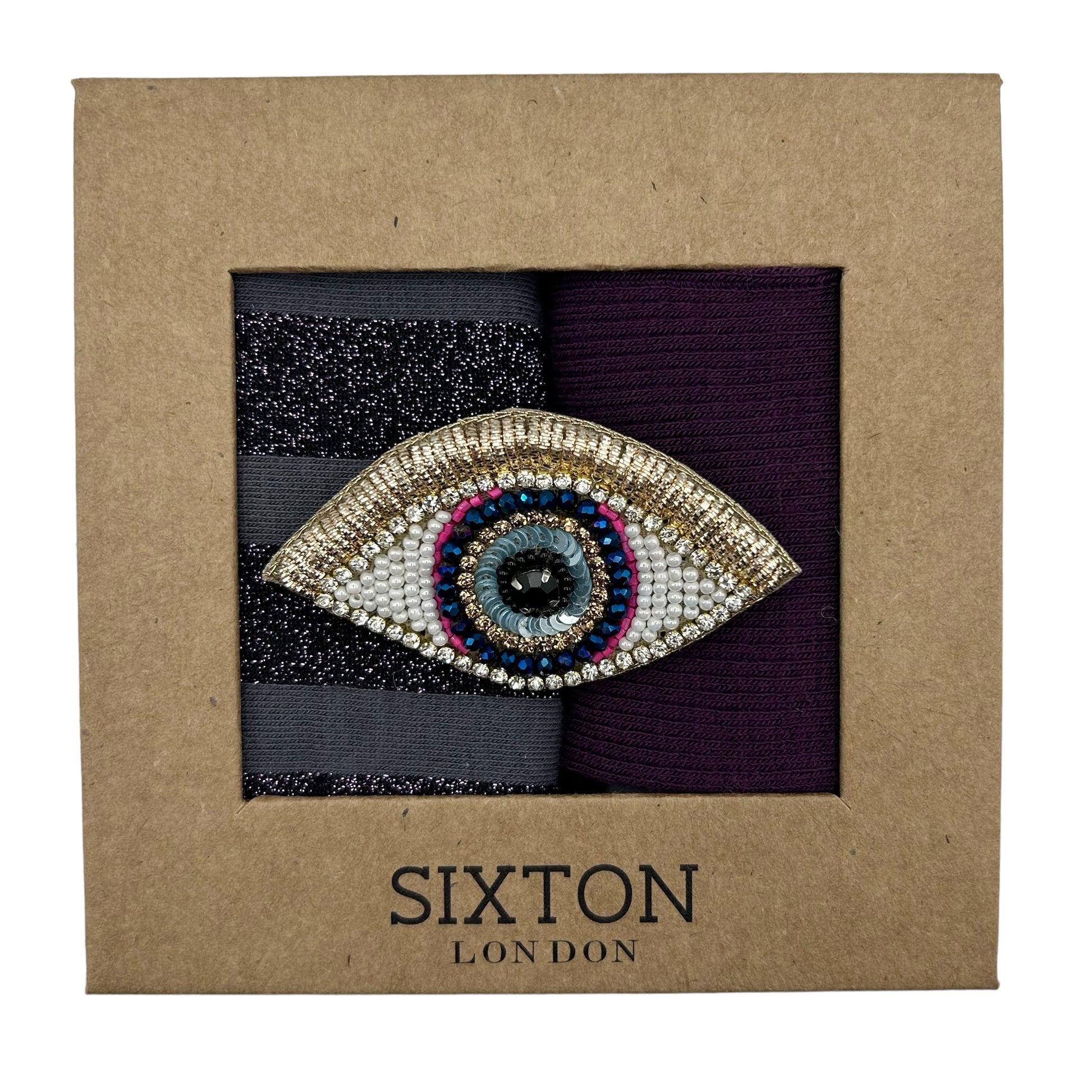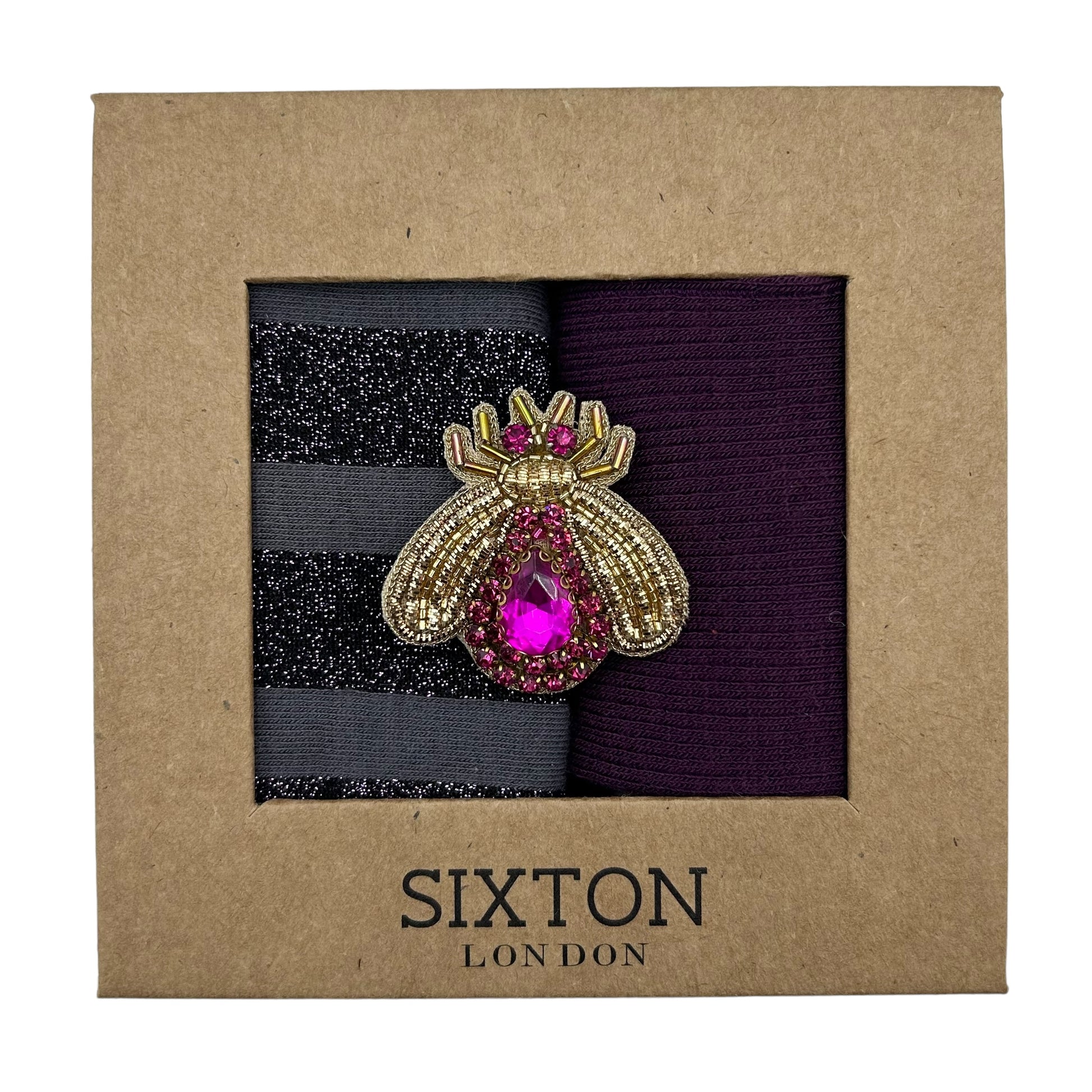 Two pairs of socks in a gift box, with an embroidered brooch.