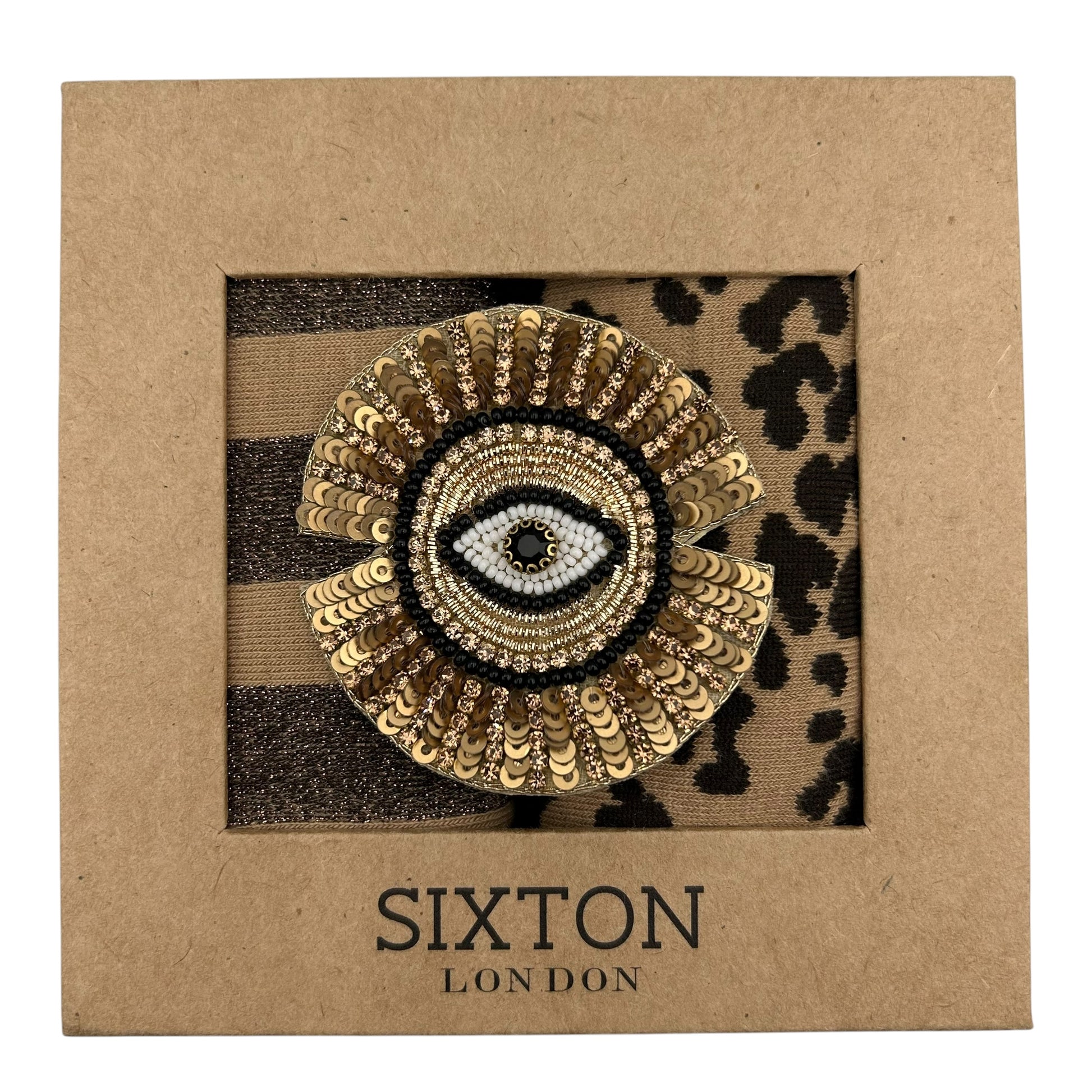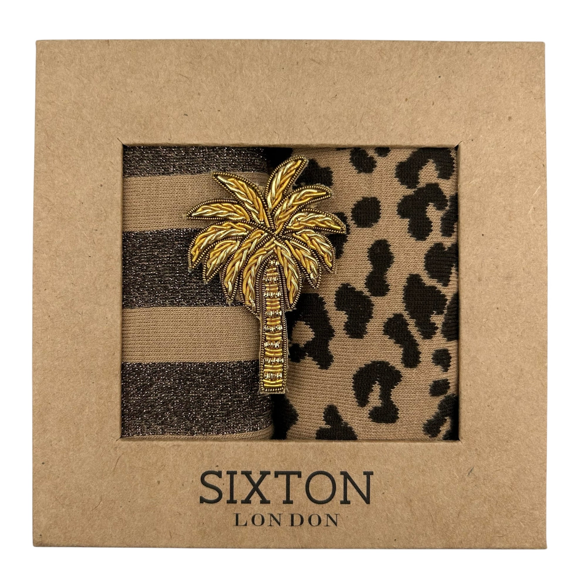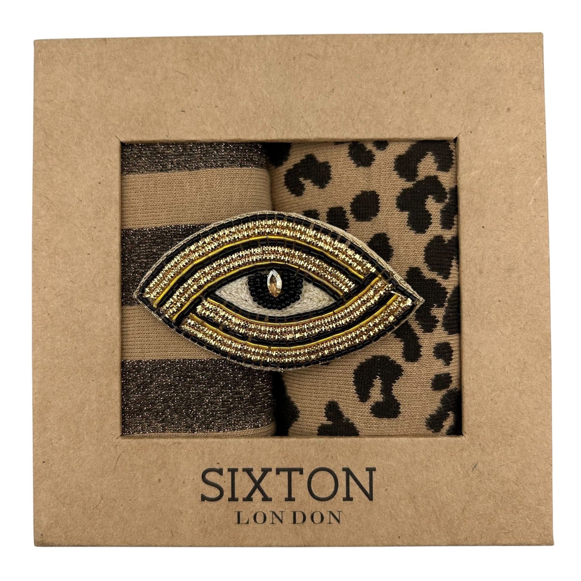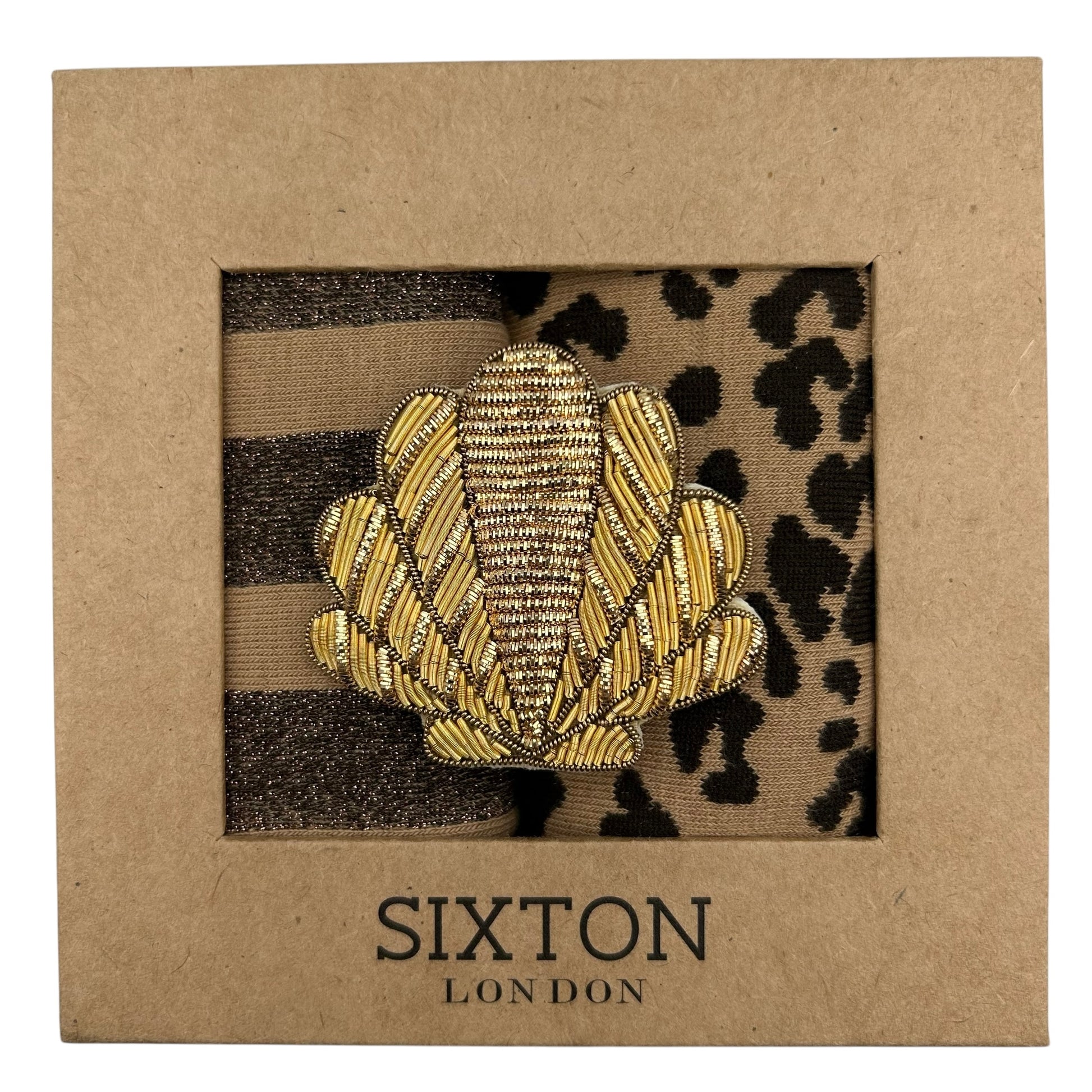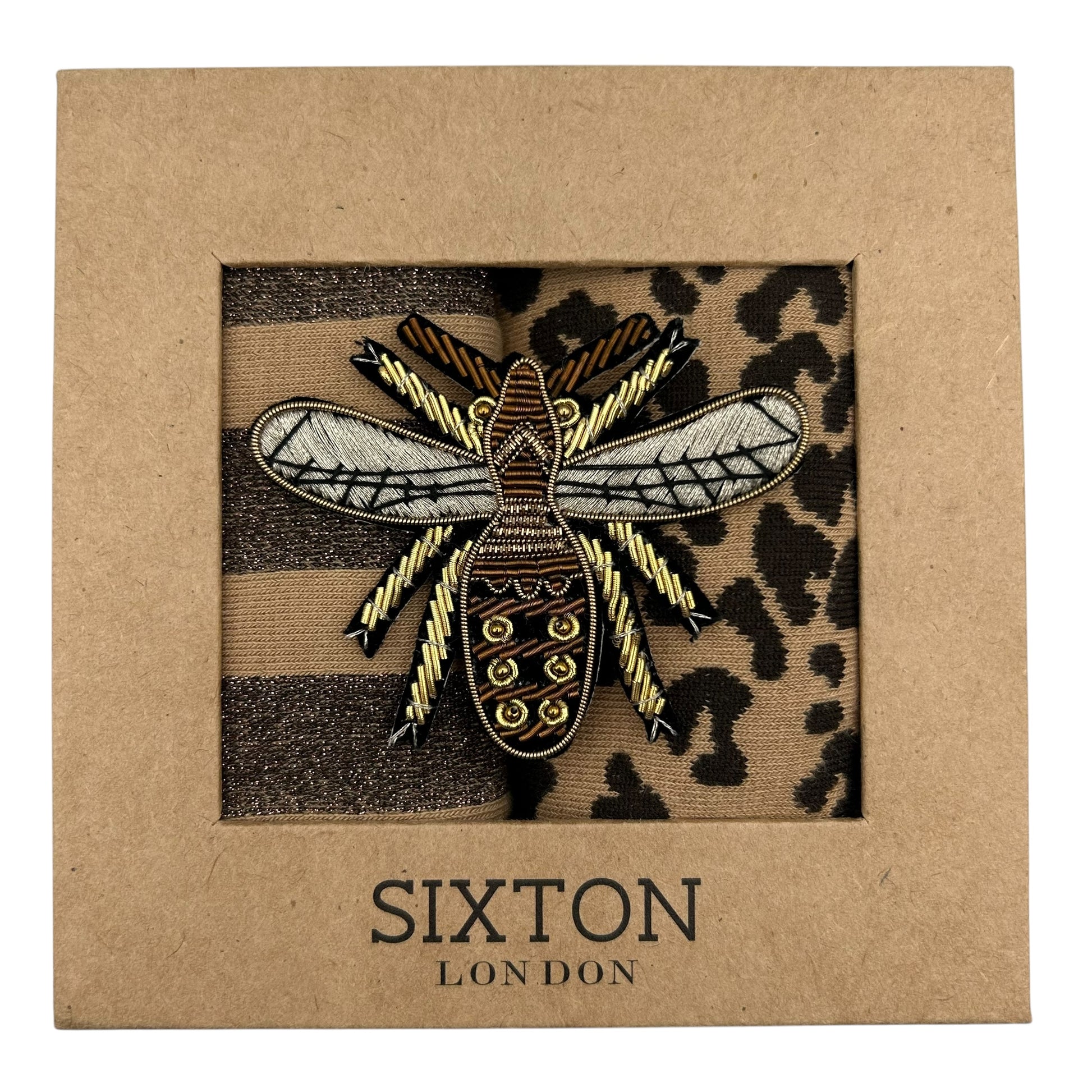 Two pairs of socks in a gift box, with an embroidered brooch.