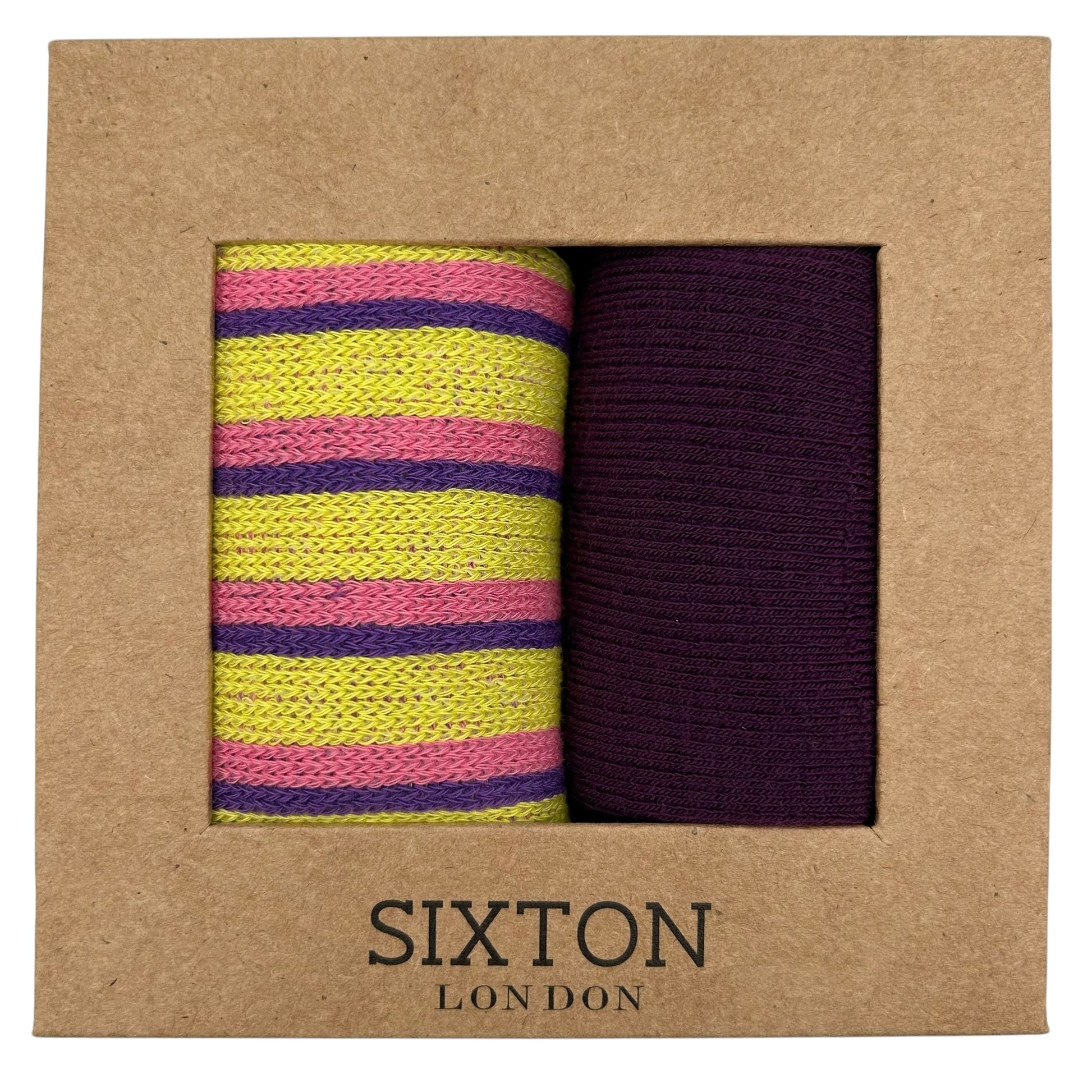 Two pairs of socks in a gift box.