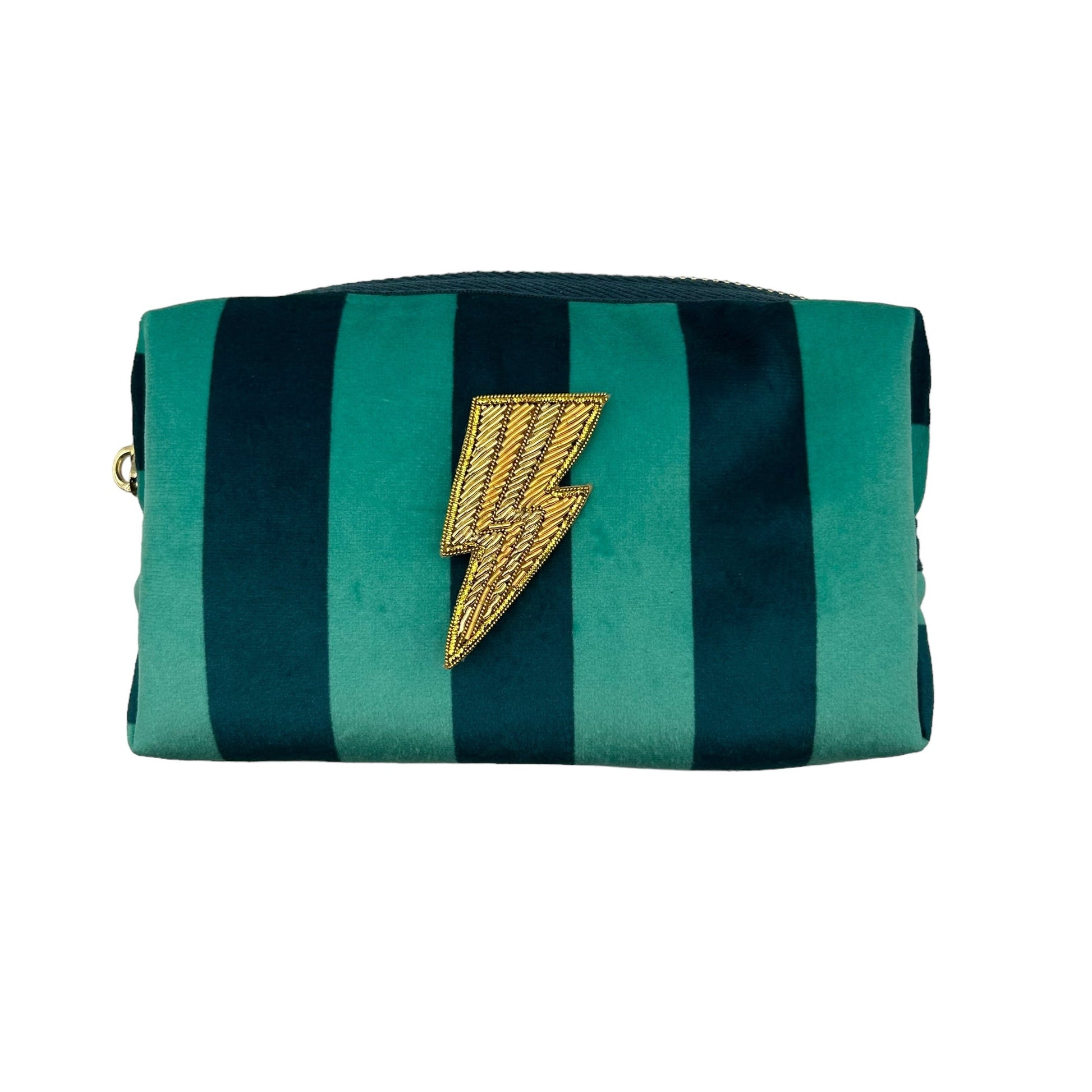 A gorgeous teal stripe velvet makeup bag, with a detachable Lightning Bolt brooch.