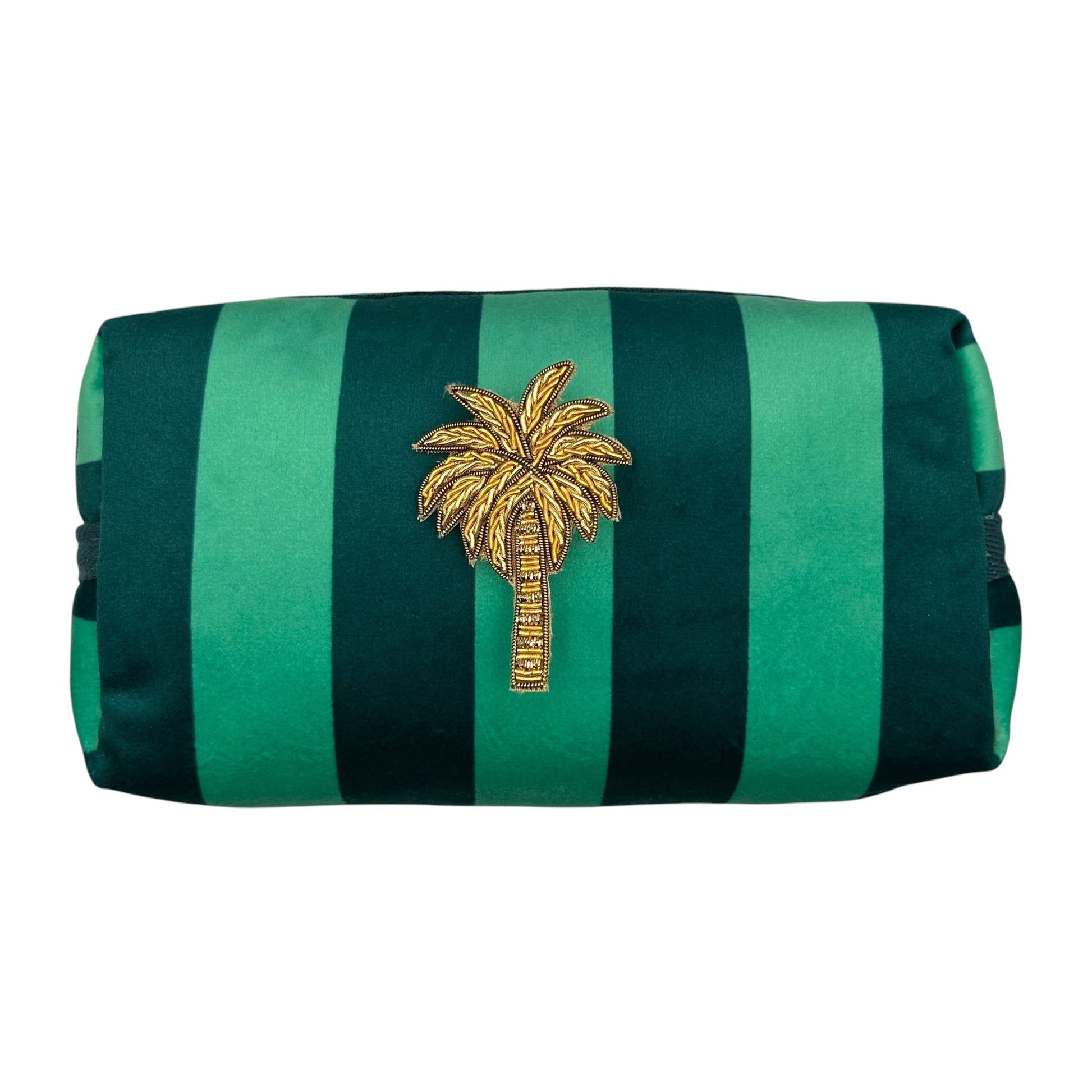 A gorgeous teal stripe velvet makeup bag, with a detachable Palm Tree brooch.